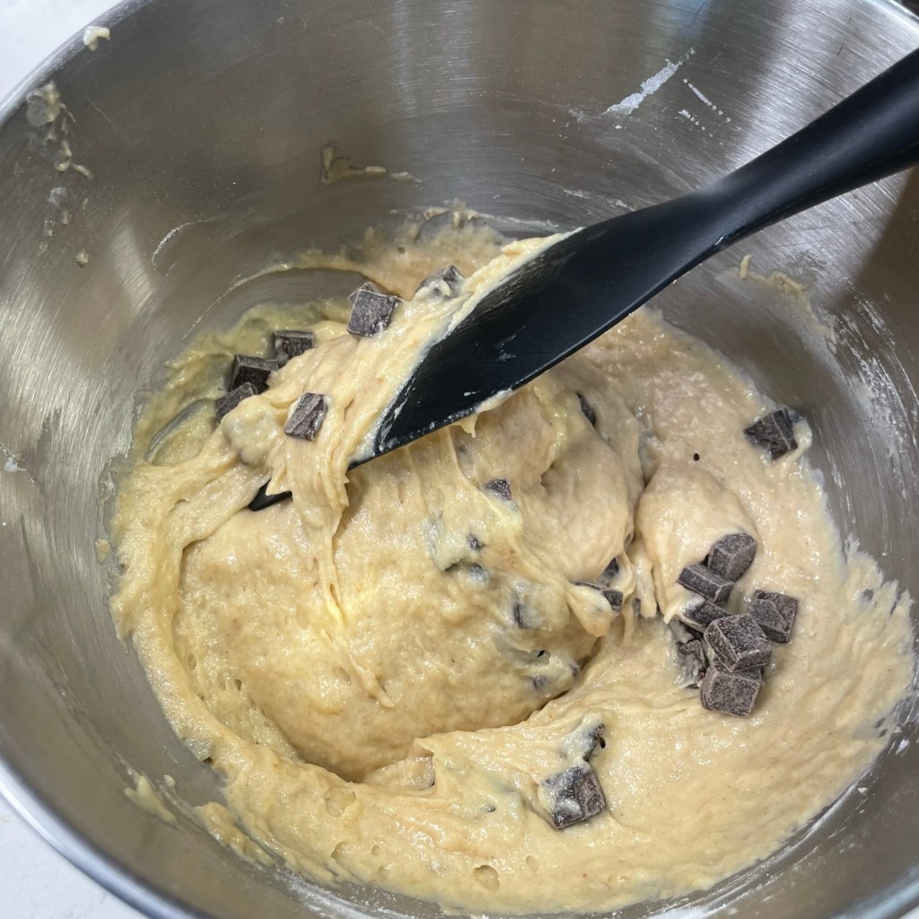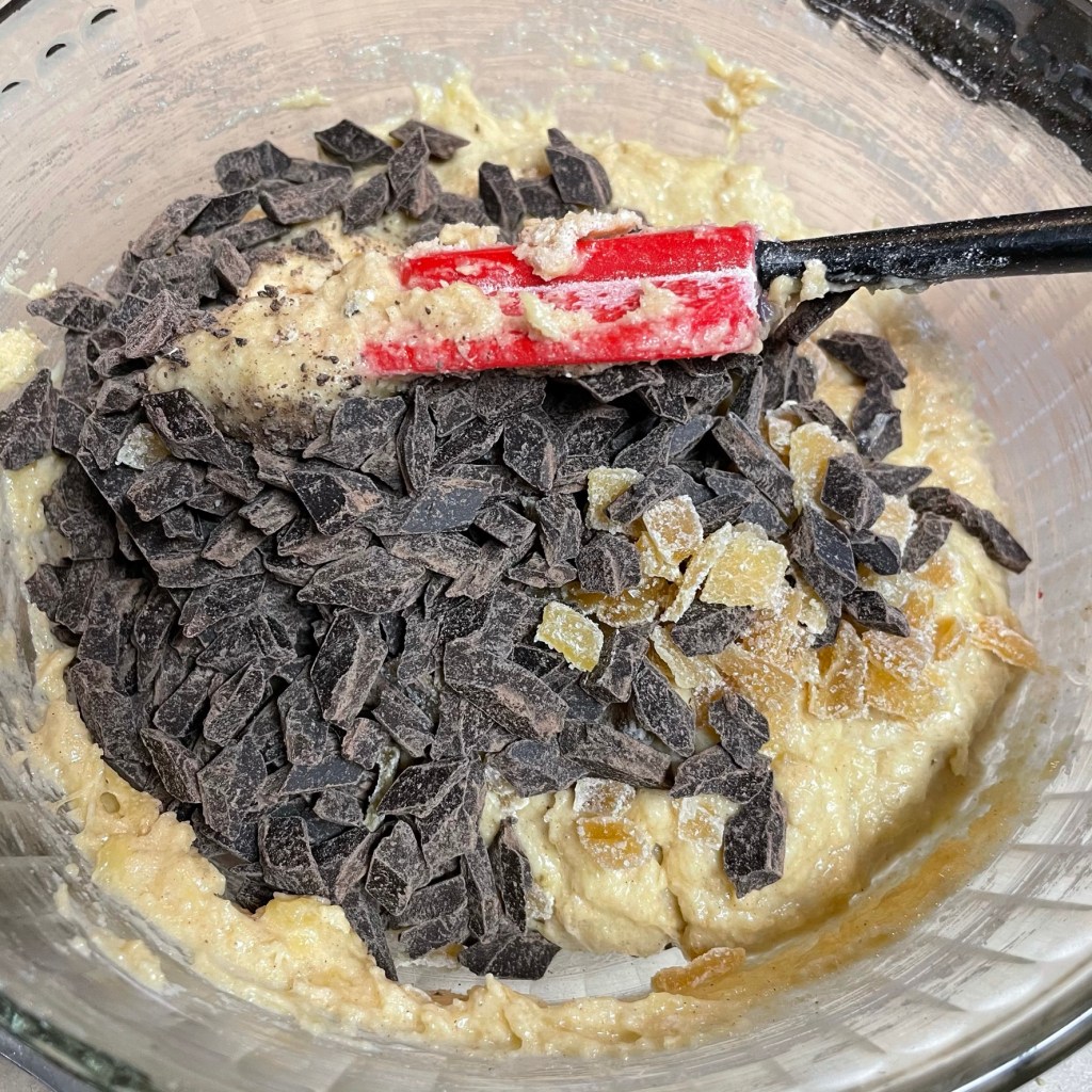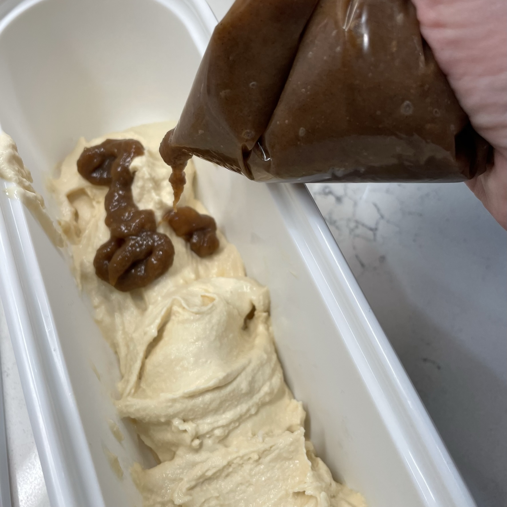 You can see how thick and rich the mixture is after that chill-down time, but a good whisking made it pourable, and then it just needed time to freeze into soft-serve texture. This usually takes about 25 minutes In my Cuisinart, long enough to cut up my banana and break a few of the Chessman cookies to be mixed in with the finished ice cream. Assembling the final product was so easy because the bananas were already mixed in. It was just a matter of layering and swirling in the cookie bits, and then it was off to the freezer for the “ripening” stage.