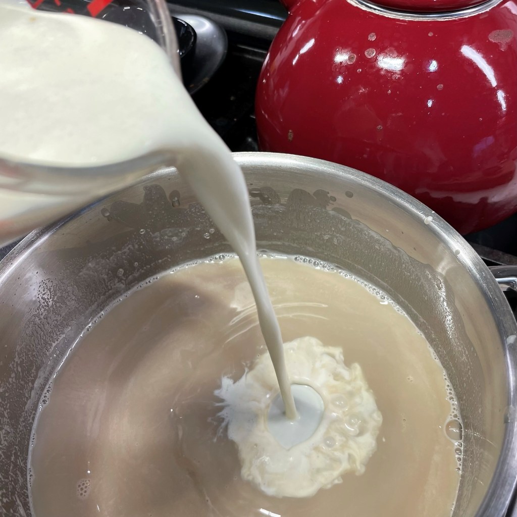 - In the bowl of a stand mixer, fitted with the whisk, blend condensed milk and whole milk until evenly combined. Add instant pudding mix and blend with the whisk on medium speed, stopping twice to scrape down the sides.