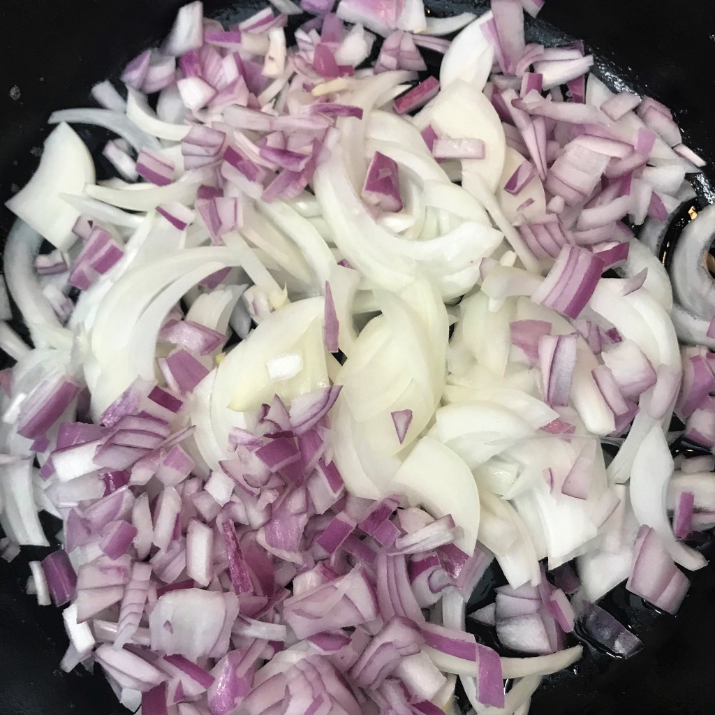 The red onions will have more caramelization because the pieces are small, and that tames their bite a little bit.