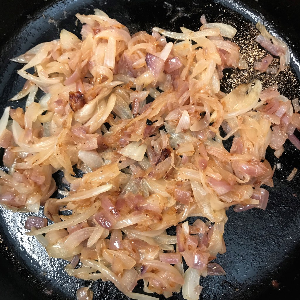 Sauté onion in bacon drippings (or olive oil) until they’re slightly soft and translucent.