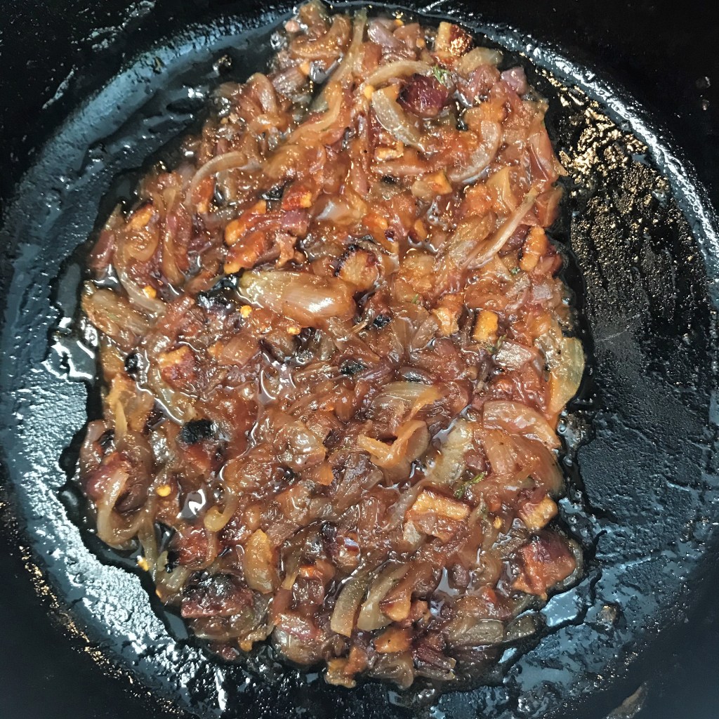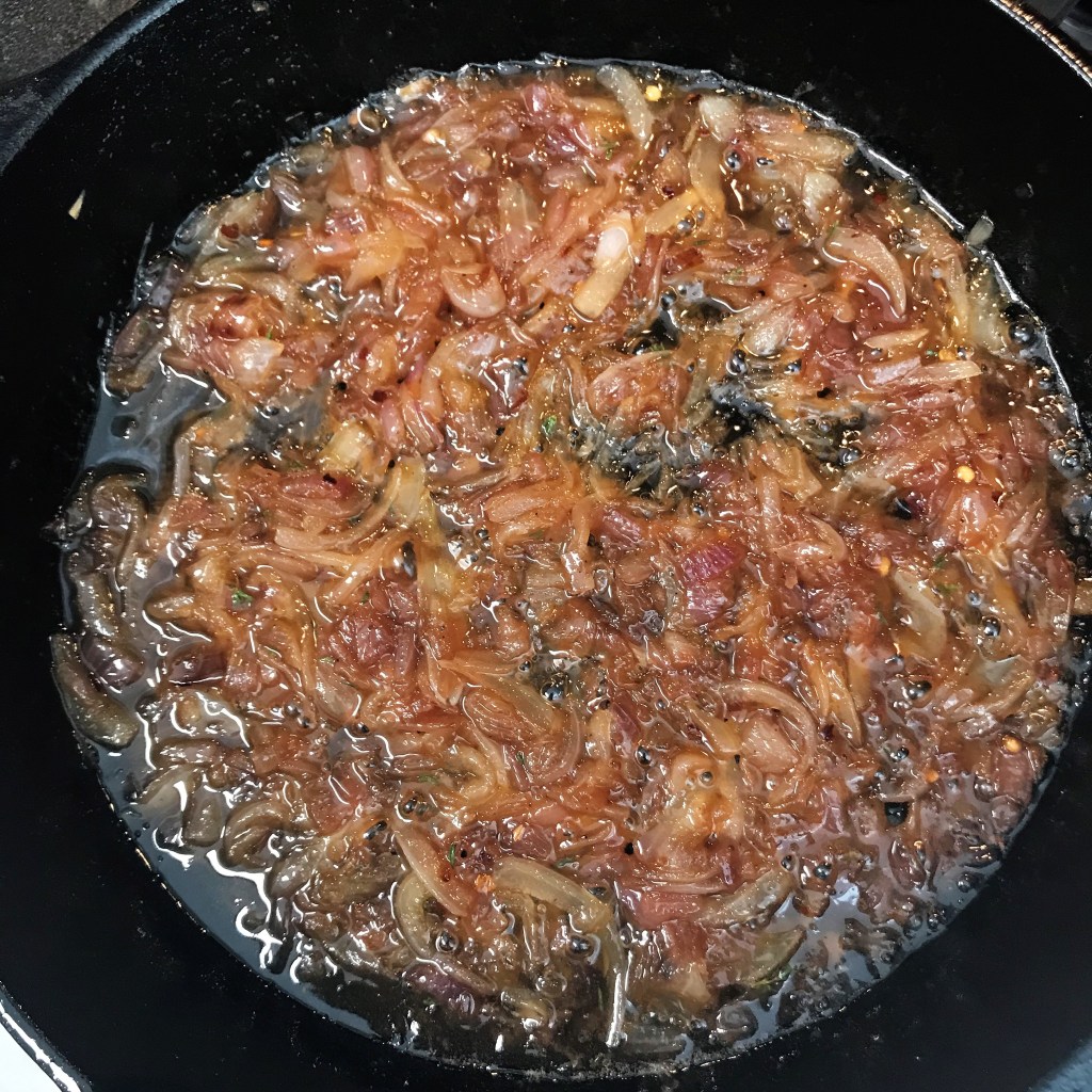 Add everything but the bacon at this point, and be patient while it reduces into sticky deliciousness.