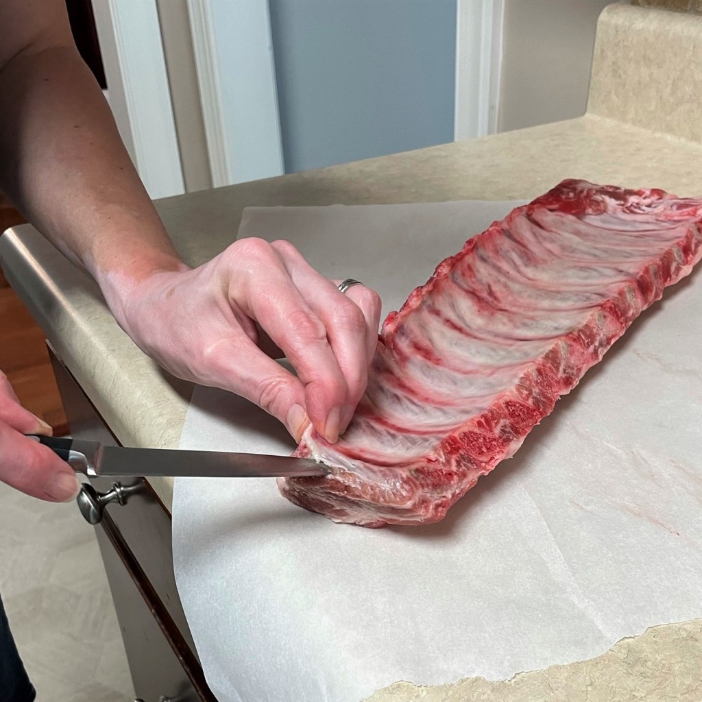 Don’t skip this step of removing the membrane from the back side of the ribs. Use a paring knife to get under it, as close to the membrane as possible without tearing it.