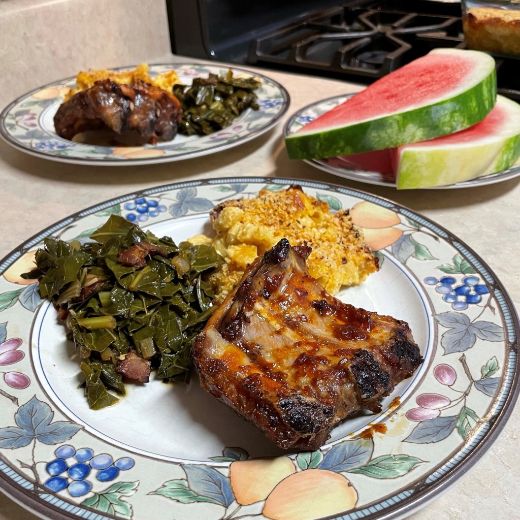 It was a southern BBQ feast, with spicy collards and homemade mac and cheese.