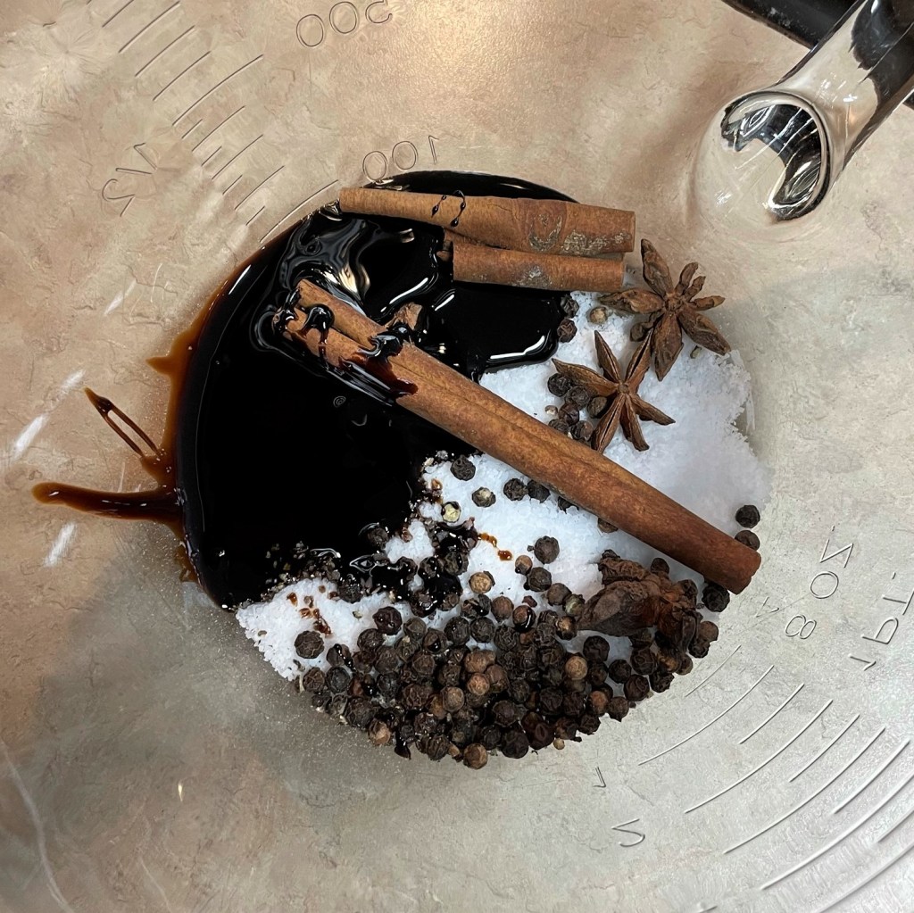 Prepare the brine by combining kosher salt, molasses, cinnamon, star anise and black pepper in a large glass pitcher bowl. Add two cups of boiling water and stir to dissolve the salt and sugar. Add ice cubes and enough cold water to make 8 cups total.