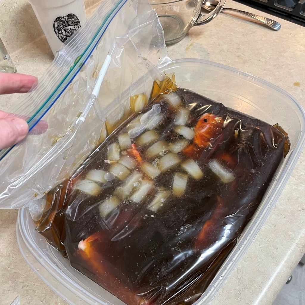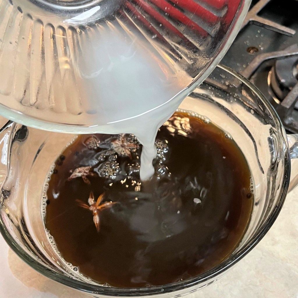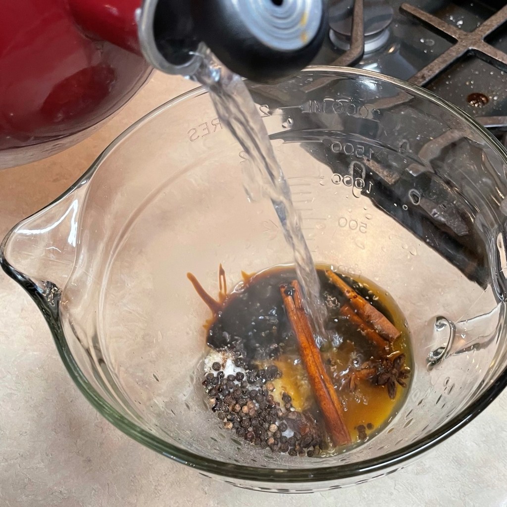 To make the brine quickly, I used only enough boiling water to dissolve the salt and molasses. Next, I added ice and cold water to chill it down.