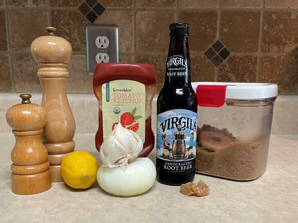 One such impulse buy stood out as a bucket list item for me, and the forced fridge cleanup gave me a push on my culinary intention of making a root beer-based barbecue sauce. I will admit that neither Les nor I are fans of carbonated soda. I have not had a Coca-Cola or 7-Up or anything like them in years (maybe decades), and I don’t miss them. My aversion is based partly on the fact that they are carbonated and leave me feeling bloated and uncomfortable, but more on the fact that nearly every soda on the market is made with high-fructose corn syrup. And that, my friends, is a total deal breaker for me. Diet sodas are no better, because I cannot abide the aftertaste of alternative sweeteners, including the plant-based stevia.