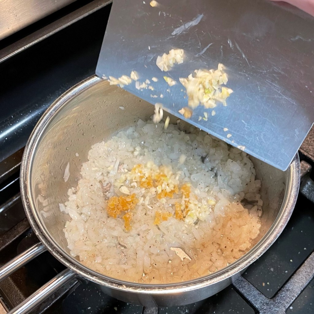 Saute the minced onions in a bit of canola oil, then add the garlic and minced ginger.