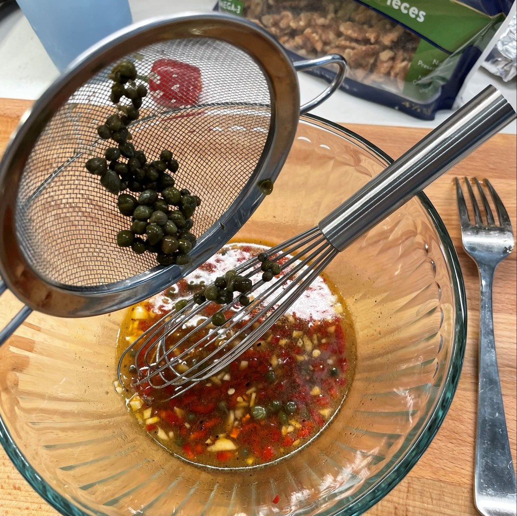 There’s nothing difficult about this autumn recipe, but it is best served immediately after cooking, so get ahead of the game by making the dressing and prepping the veggies early so that putting it together at dinner time is a snap. Here we go!