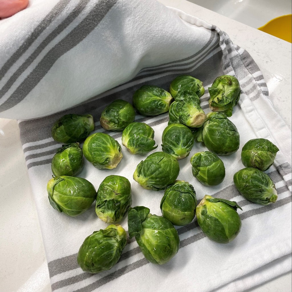 - Rinse and gently toss fresh Brussels sprouts in a colander under running water. Trim off brown ends and cut the sprouts in half lengthwise, discarding any damaged or discolored leaves. Spread the sprouts out onto a clean kitchen towel, and then roll it up and place it in a large bowl in the fridge for a couple of hours or up to one day. Let them sit a room temperature for an hour or so before roasting.