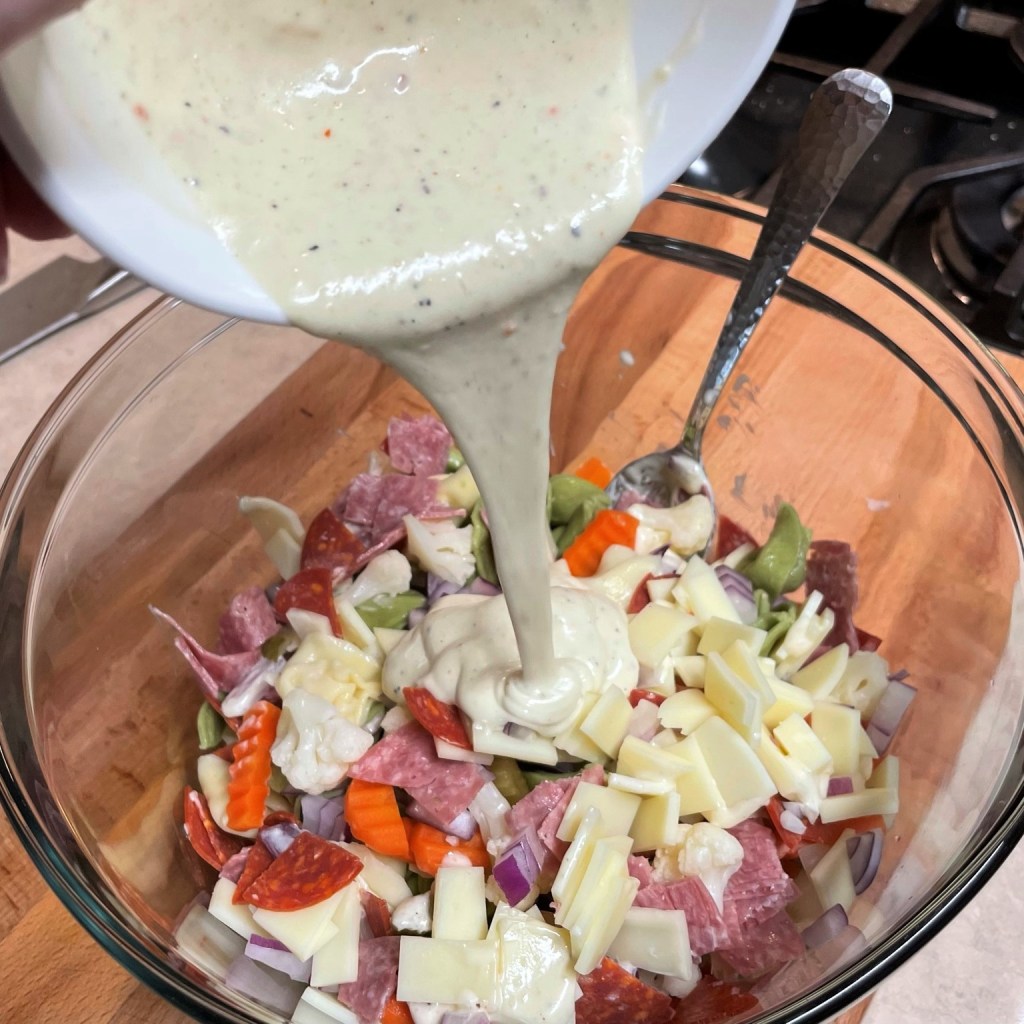 Pour the Italian dressing over the salad ingredients and use a rubber spatula to gently fold the mix together.