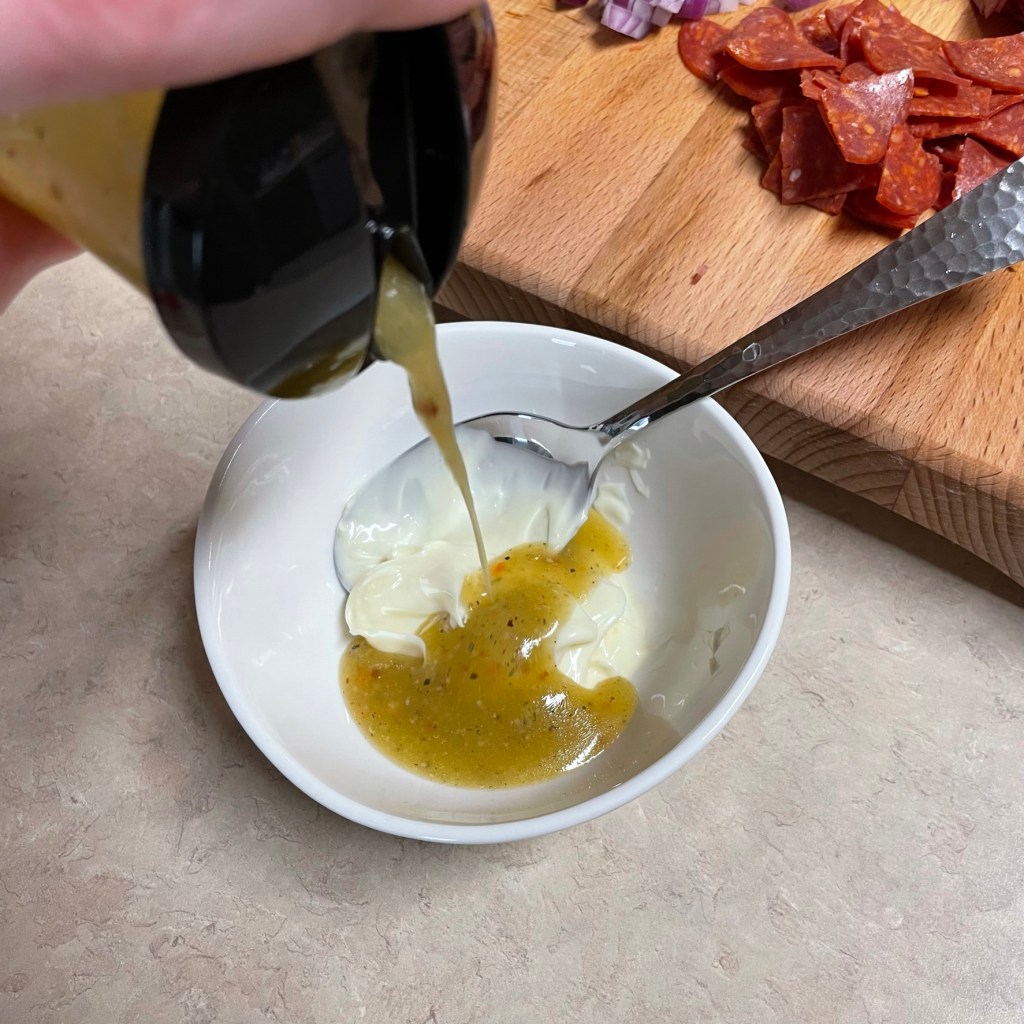 This salad would work with Italian dressing on its own, but I wanted a creamier version, so I mixed it with a couple of tablespoons of mayonnaise.