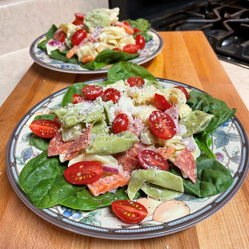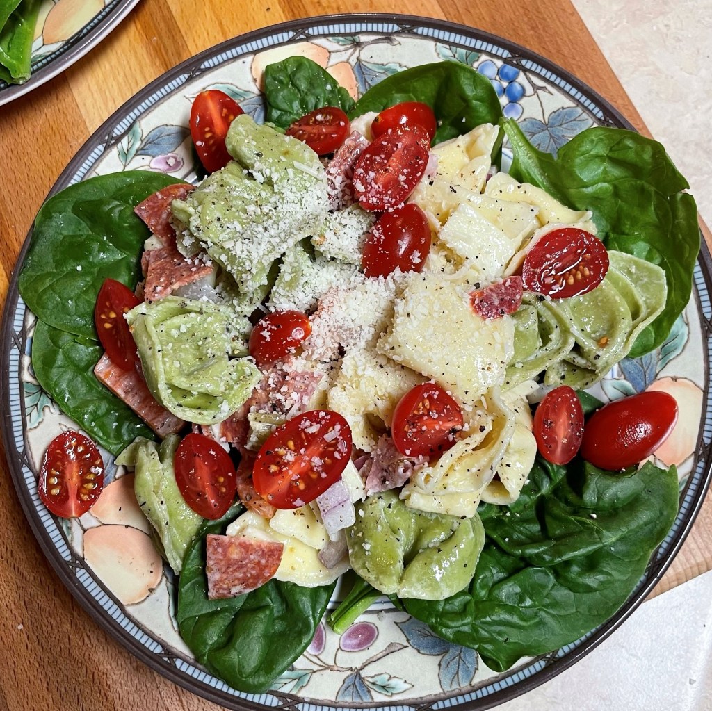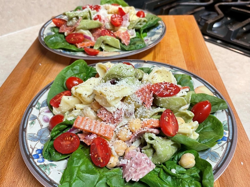 To make good on my promise for a twist on pasta salad, I let my imagination run wild through an Italian deli case and all the salty, meaty, cheesy flavors one might find there. Initially, I had planned to use a basic pasta shape, such as penne or rotini, but I stepped it up and used cheese-stuffed tortellini instead. The result is this hearty, satisfying salad that could be a side dish (if you have the discipline to only scoop out a little bit of it), but we found it perfectly filling as a cool dinner salad, served up on a bed of fresh baby spinach and topped with halved grape tomatoes.