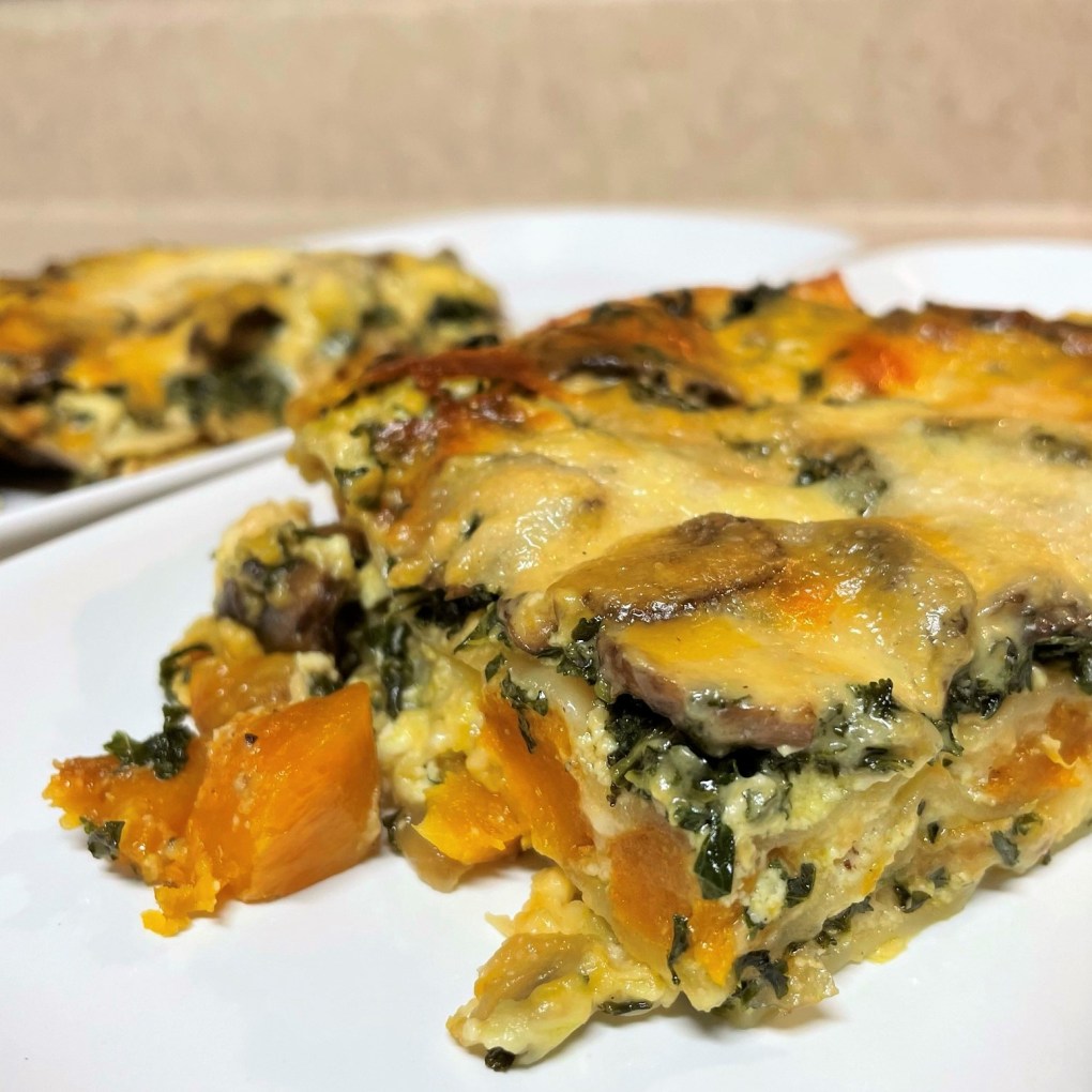 Ladle about 1/2 cup of the butternut-bechamel sauce into the bottom of a 9 x 13 glass baking dish. Then, layer the individual components as follows: