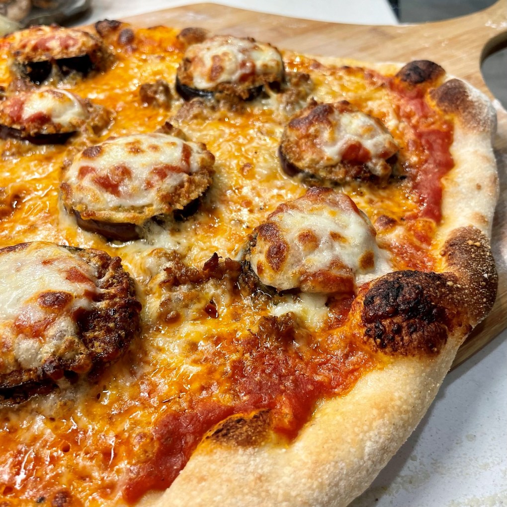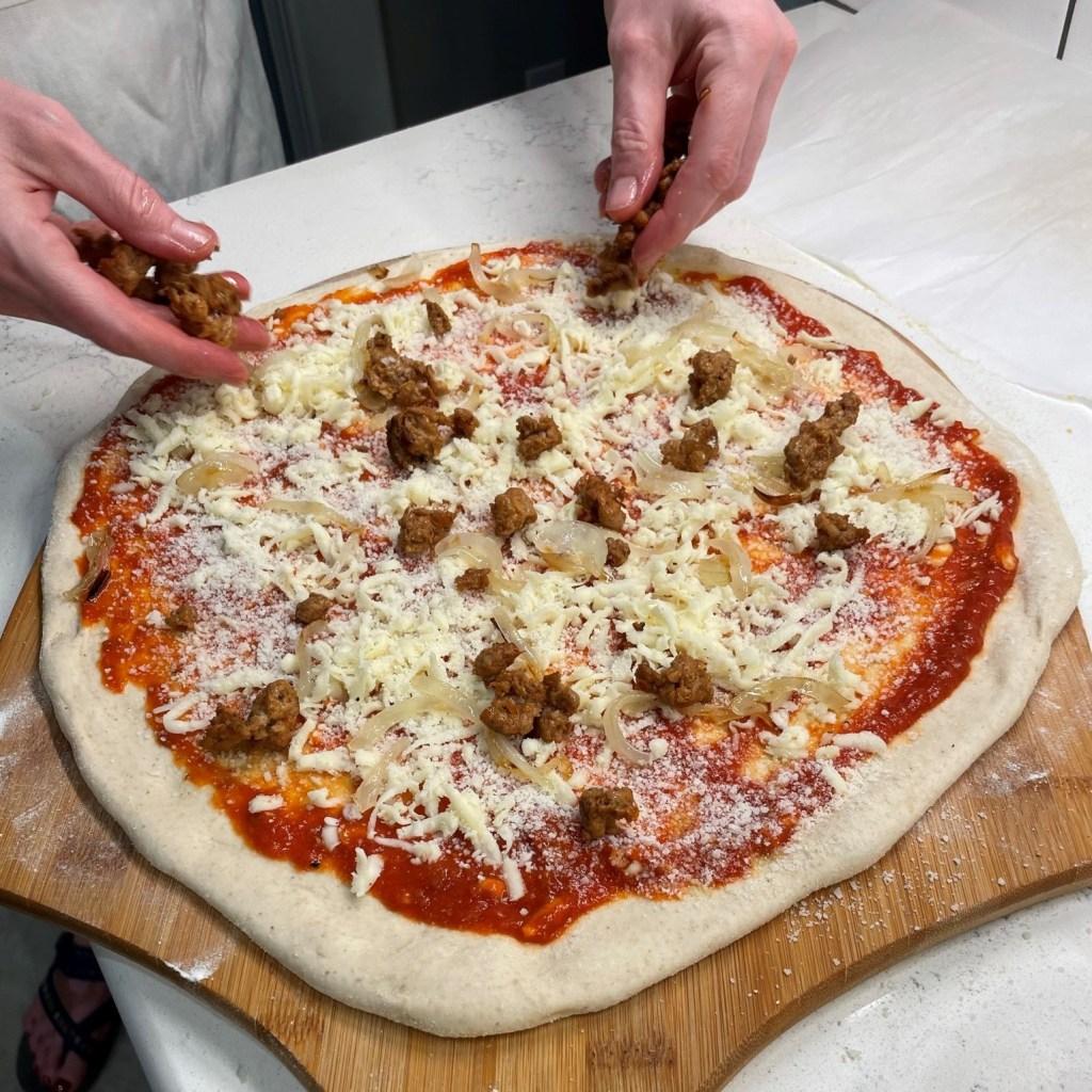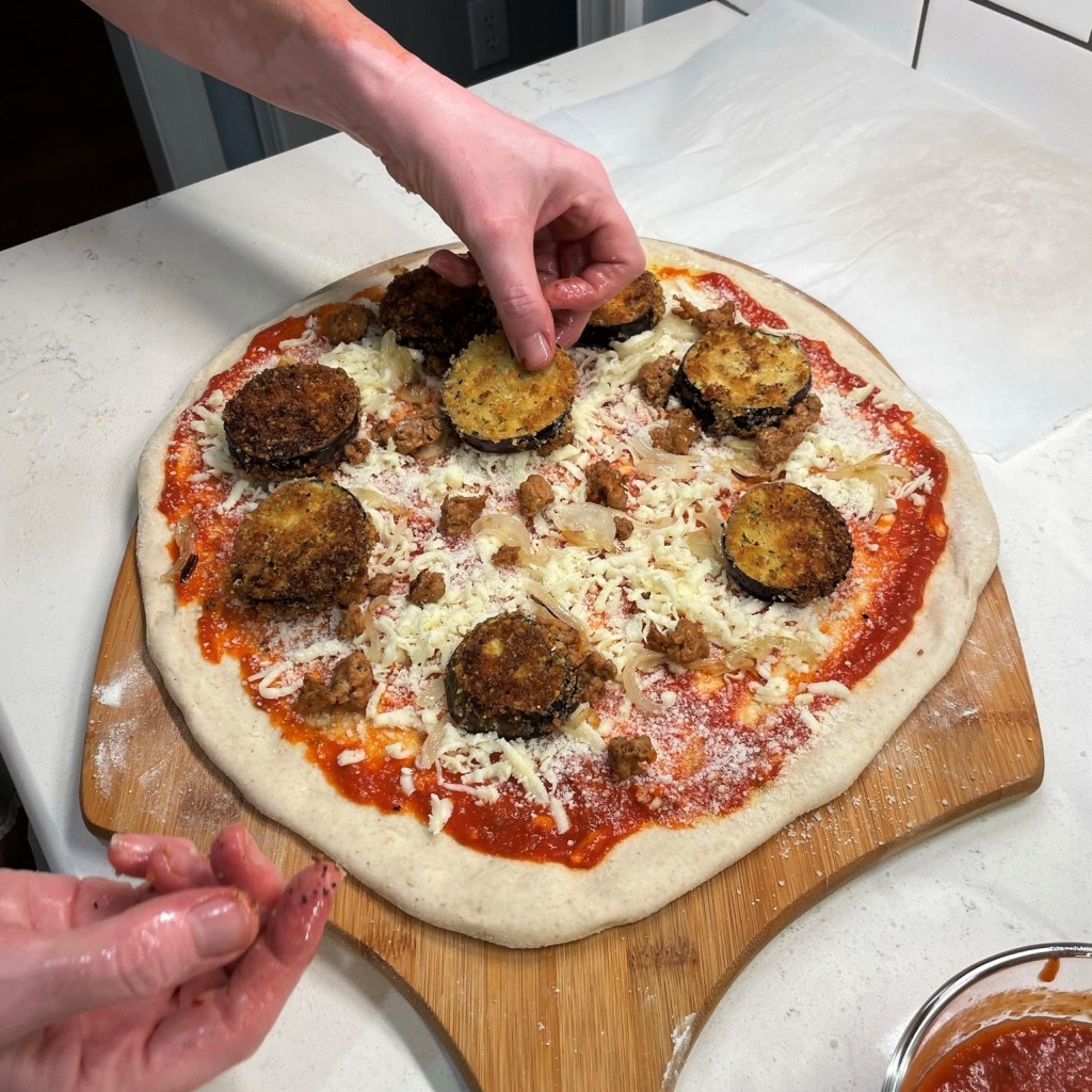 Shape pizza dough into a 14-inch round. Drizzle with olive oil, then swirl half of the pizza sauce onto the dough. Top with 1/2 cup of the shredded mozzarella, reserving the rest for the top of the eggplant rounds. Scatter the sauteed onions and cooked sausage crumbles over the cheese layer.
