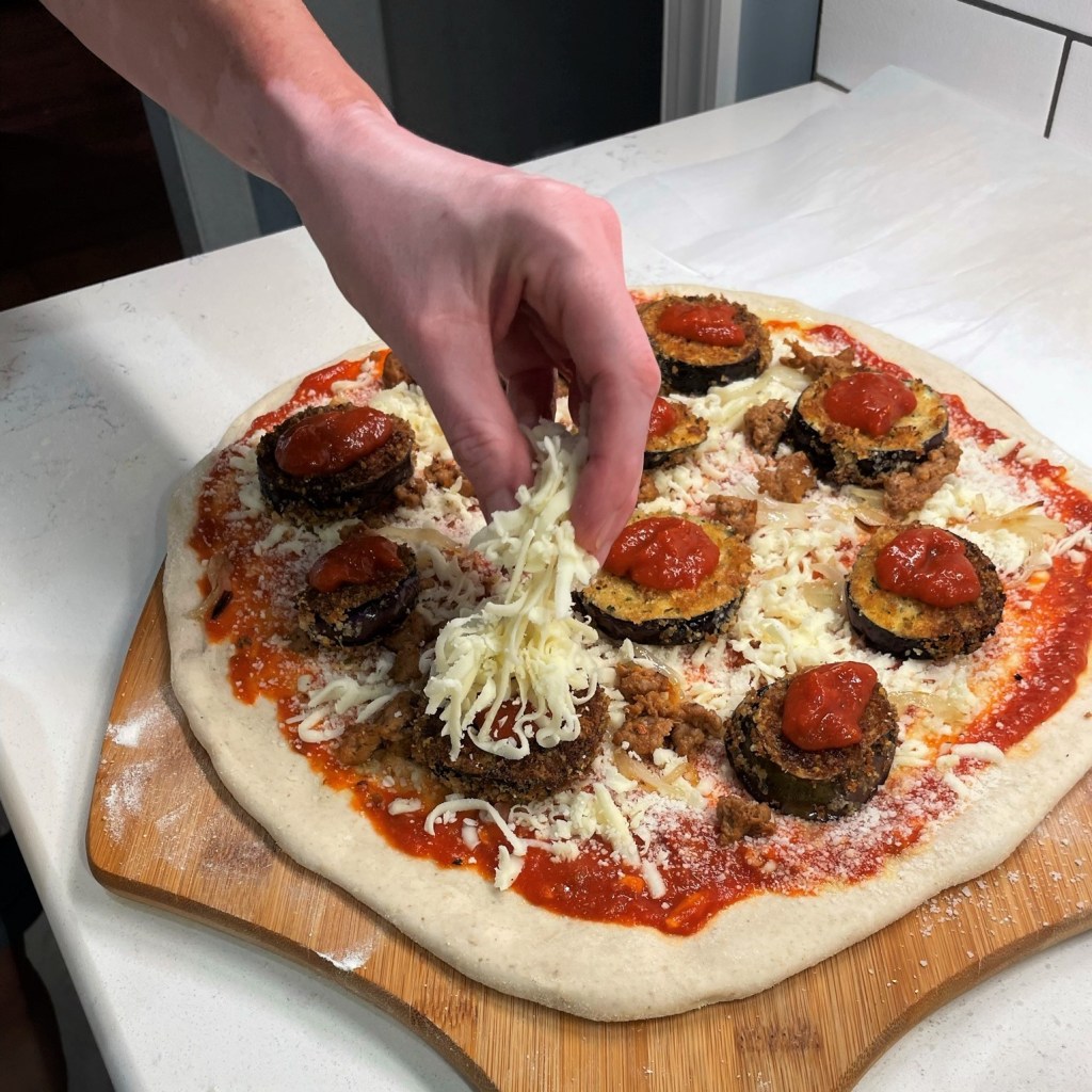The crispy eggplant had plenty of flavor on its own, but we wanted to pair it with some complementary flavors, including soft, sauteed onions and a little bit of spicy sausage that I had left over from another recipe. I laid those down on a layer of shredded mozzarella, over our usual pizza sauce, with a few sprinkles of our Parm-Romano blend.
