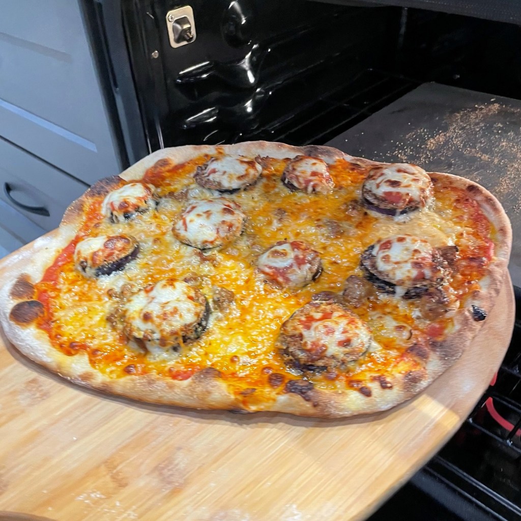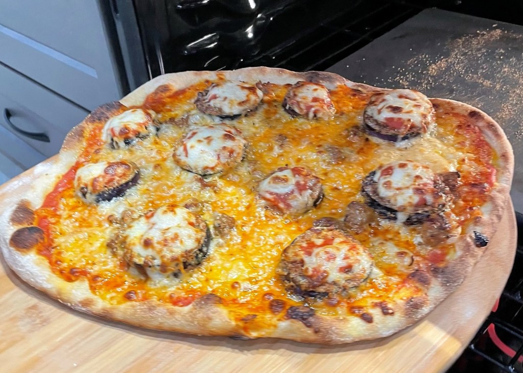 Into the 550° F oven on our beloved pizza steel, and six minutes later, we had this delicious Italian hybrid masterpiece!