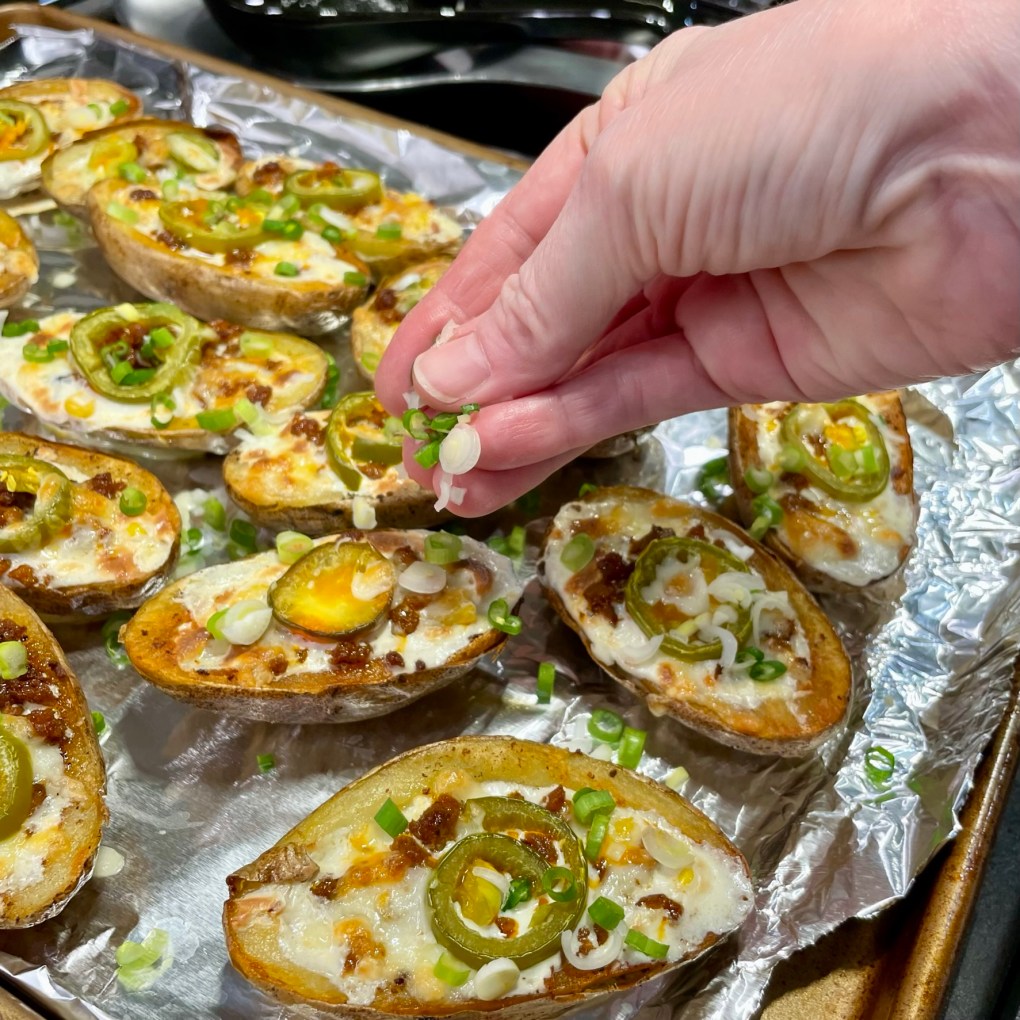 Place skins back into the 400°F oven for about 5 minutes, until cheese is melted and bubbly and skins are heated through. Sprinkle with sliced scallions and serve immediately.