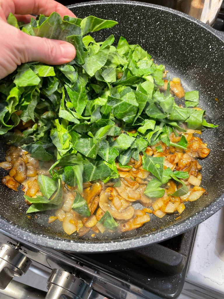 For this iteration of collard greens, I started with a local spicy pork breakfast sausage, browned up in bulk with chopped onions and a few garlic cloves, plus a smoky pepper seasoning. When I was happy with the browning, I transferred the meat mixture into a separate bowl while I sautéed the collards, one handful at a time, just as the nice grocery lady told me.