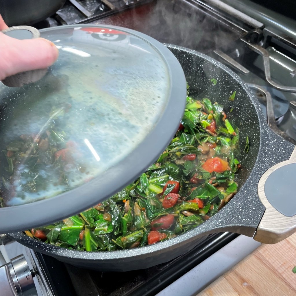 I’m amused recalling that I once shied away from making collard greens at home. I liked them, but had no idea how to transform the thick, leathery leaves into something tender and edible. There are two schools of thought on this, and the first was daunting enough that I kept my distance for years. It involves a dense, salty hunk of what our locals call “fatback,” and boiling (or even pressure cooking) the collards for hours on end, until they no longer resemble a vegetable. Some people love it; I do not.