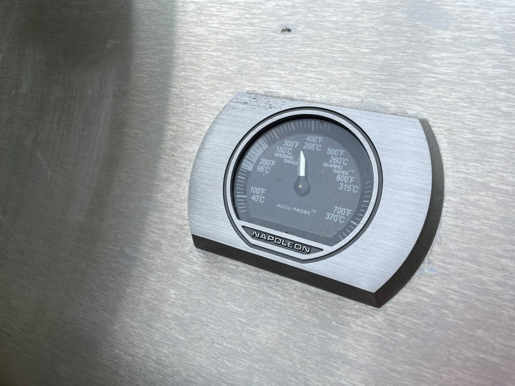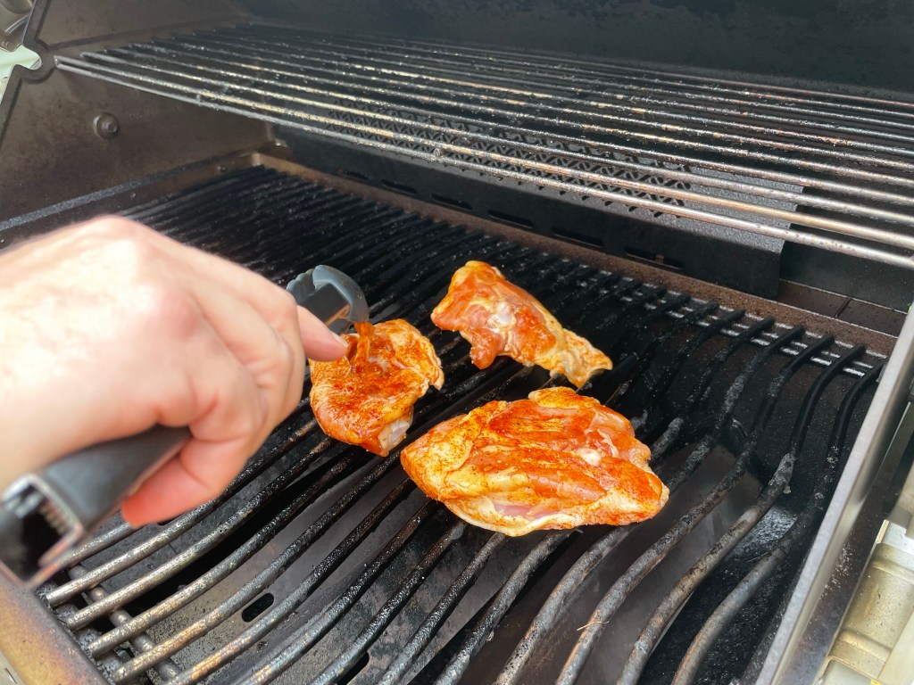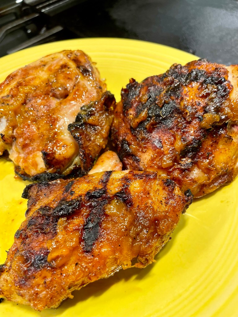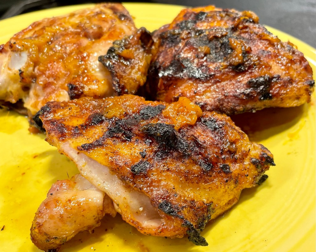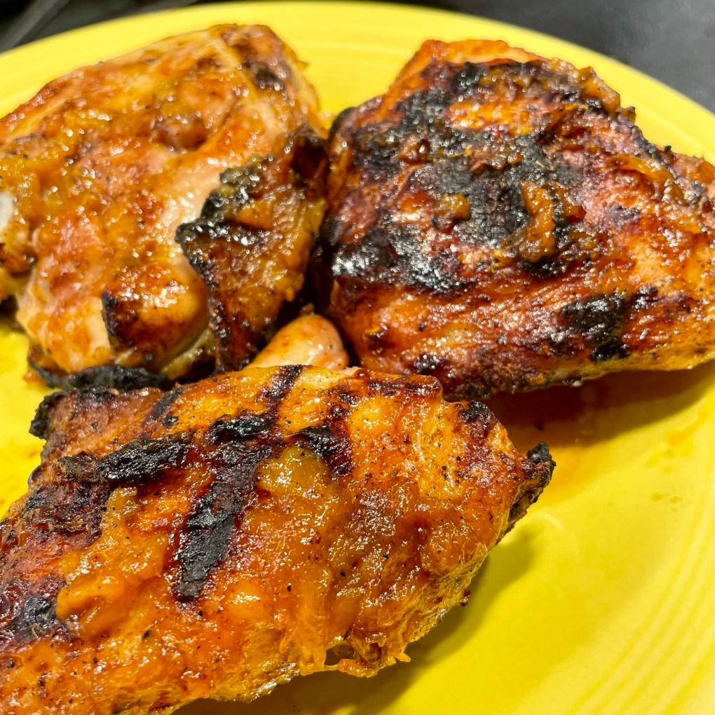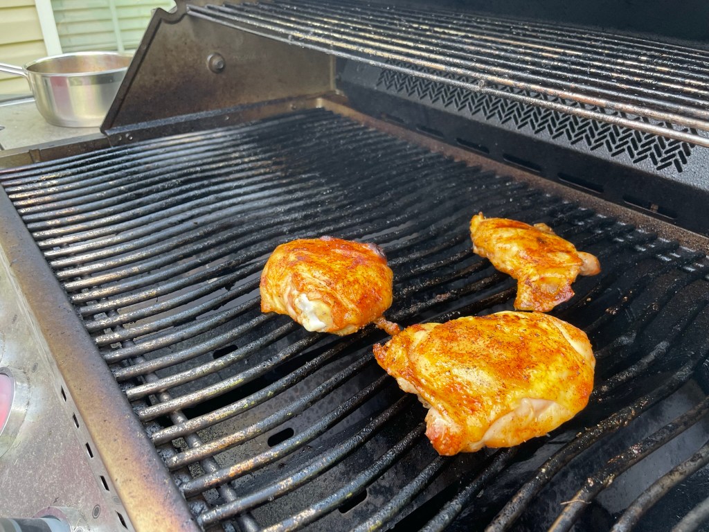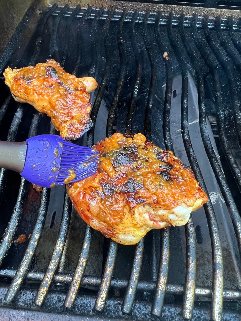 The rest of the process belonged to my husband, also known here as “Master of the Grill.” He has been relentless in learning the nuances of our new Napoleon gas grill with its numerous bells and whistles, including infrared searing zones, and some of those features come with a steep learning curve. For chicken thighs, Napoleon recommends a “reverse-sear” technique—Kenji would approve— and so Les preheated the grill to 350° F, with indirect heat on one side. The goal with this kind of cooking is to slow-cook the meat to achieve proper temperature before sealing the deal with crispy skin and glaze.