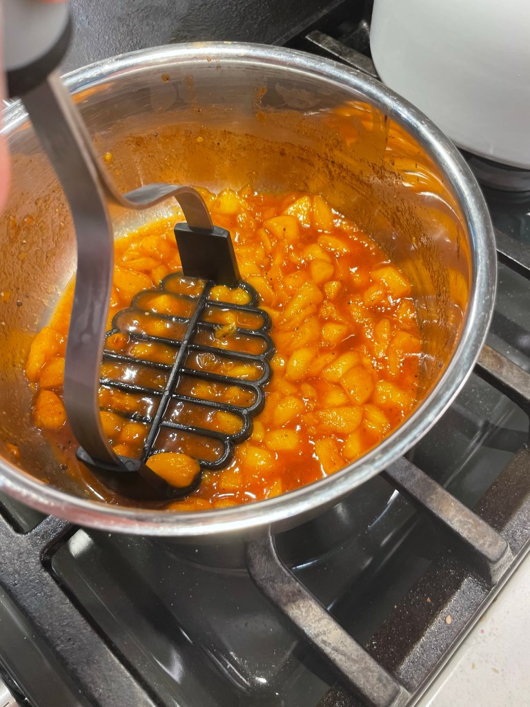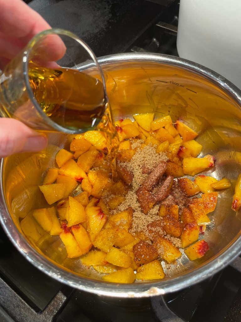 - Add diced peaches to a small saucepan with remaining spice blend and another teaspoon of brown sugar. Pour in half of the bourbon and cook over medium low heat until peaches break down and mixture is slightly syrupy. If needed, add a splash or two of water to achieve this consistency.