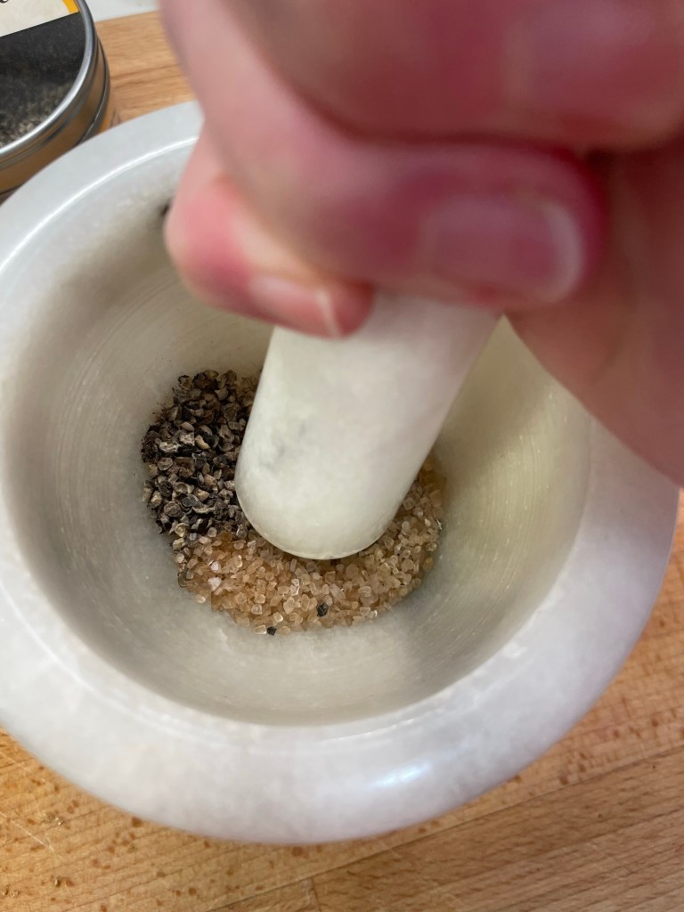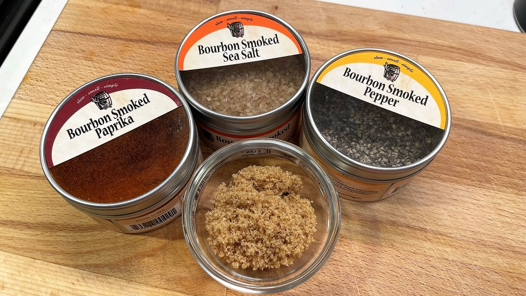 Peaches are sweet, juicy and summery. What complements sweet? Tart, spice or smoke. That helps narrow down my next move toward pairing flavors. Bourbon is strong, with a boozy bite and a light smokiness from oak barrel aging, so I already have a complementary flavor profile (smoke) taking shape. I can inch it further toward smoke with introduction of a spice, but which ones are smoky? Off the top of my head, I know I have cumin, but that starts heading off into more specific ethnic cuisines (Mexican or Indian), which is not where I’m going. I wanted this to taste like an all-American summer. Paprika is also smoky and brings the benefit of adding vibrant brick-red color. That’s my choice for this dish, and I happen to have a bourbon-smoked paprika, which is a no-brainer here. Finally, I want to take the edge off the bourbon without losing its flavor, and a bit of brown sugar will do that while also supporting the sweetness of the peach. See how easy that was?