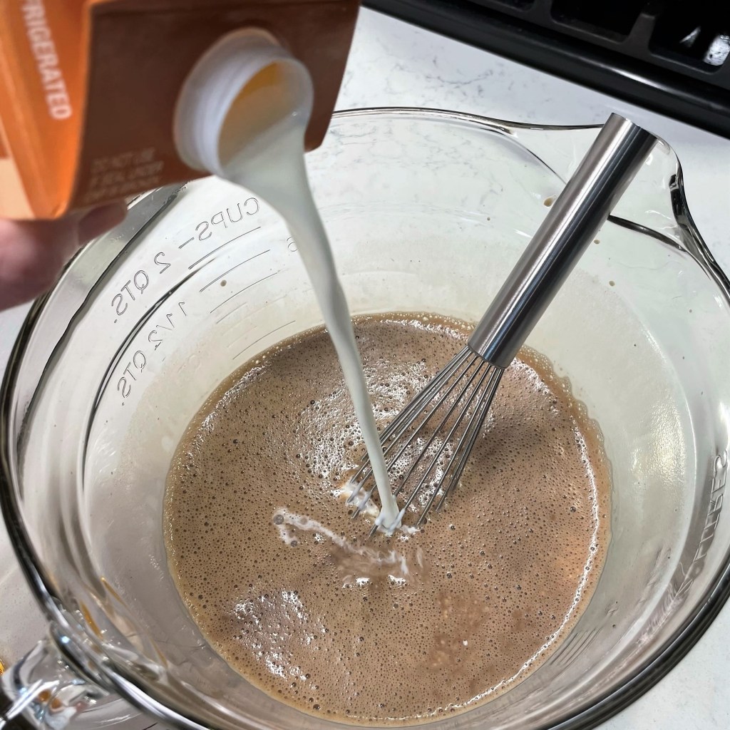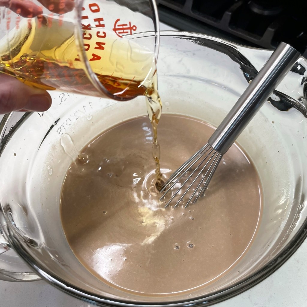 First and foremost, I’ve learned the importance of getting my ducks in a row. Things go much more smoothly when I take the time to measure out and line up my ingredients. Here, you see that I’ve organized everything into the order I’ll need them. I took time to make fresh coffee for the batter, and I even measured out the Jameson and Bailey’s so that they were ready at the right time. I cannot describe how much this single practice has changed my baking game. If you struggle with getting things right in baking, maybe this will help you, too.
