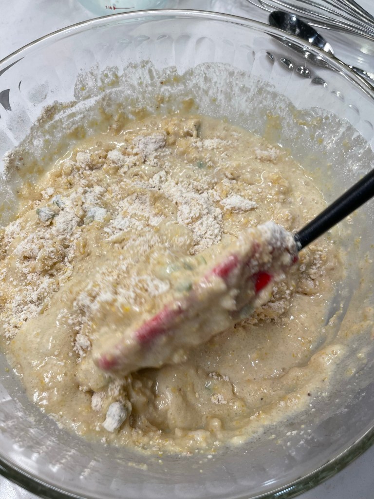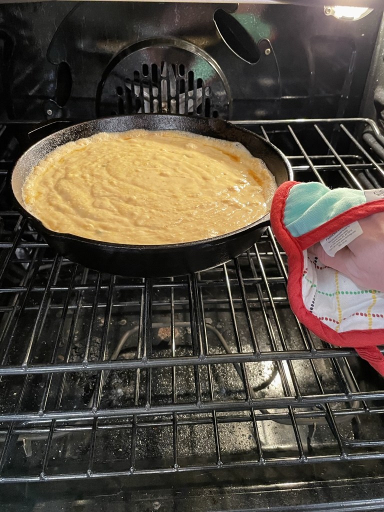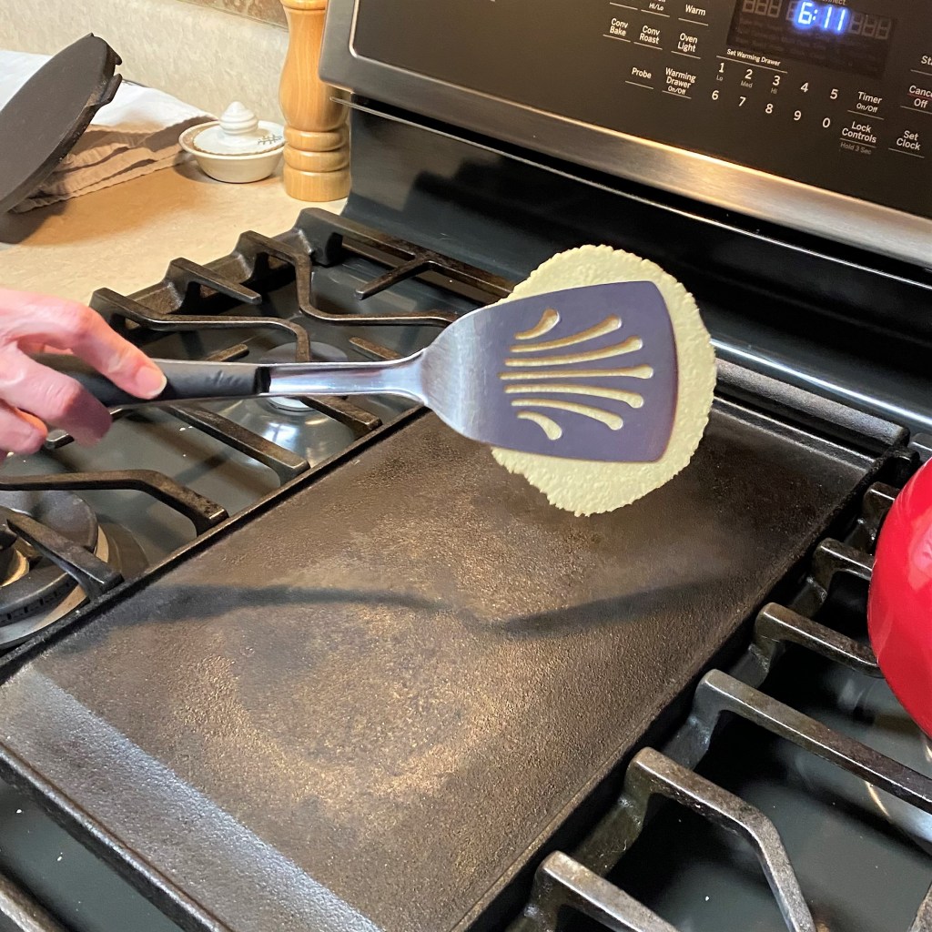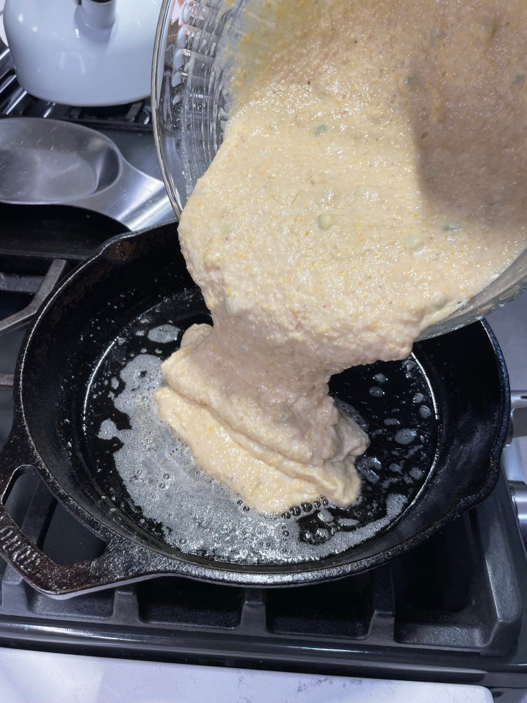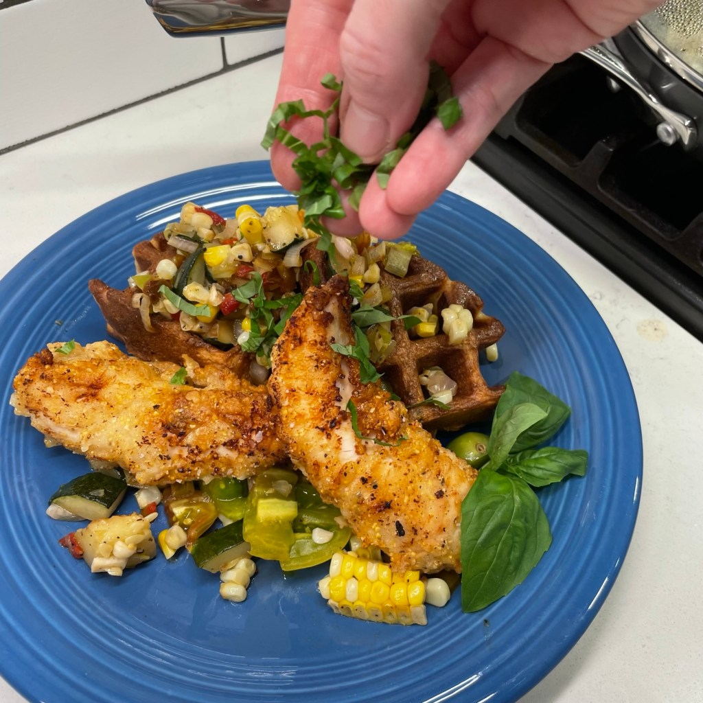 My littleneck clams came from my favorite local seafood shop— fresh from the Atlantic, already cleaned, shucked and chopped. For obvious reasons, they couldn’t go onto the pizza in their shells. After the potatoes were crisped up, I poured the flavorful clam “liquor” into the pan, and swirled in some butter with fresh parsley to dollop on the pizza before baking. I stripped an ear of grilled corn and chopped up the baby spinach, and we were ready to rock and roll.