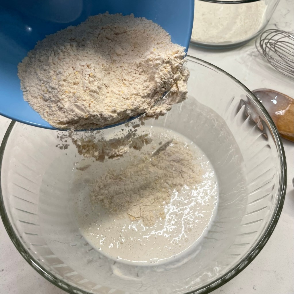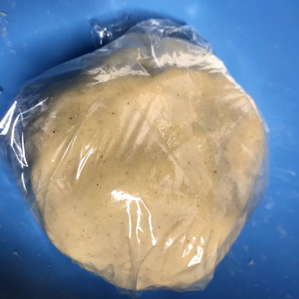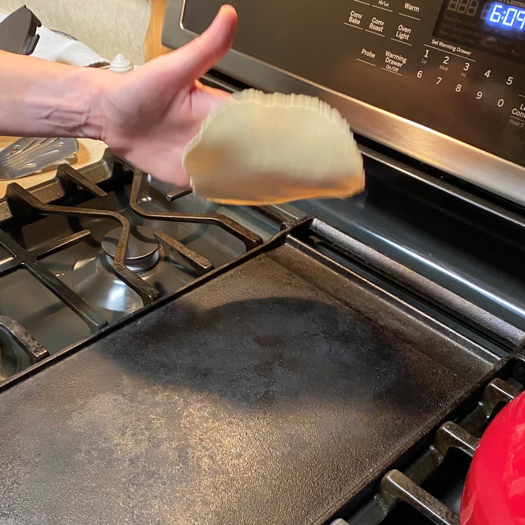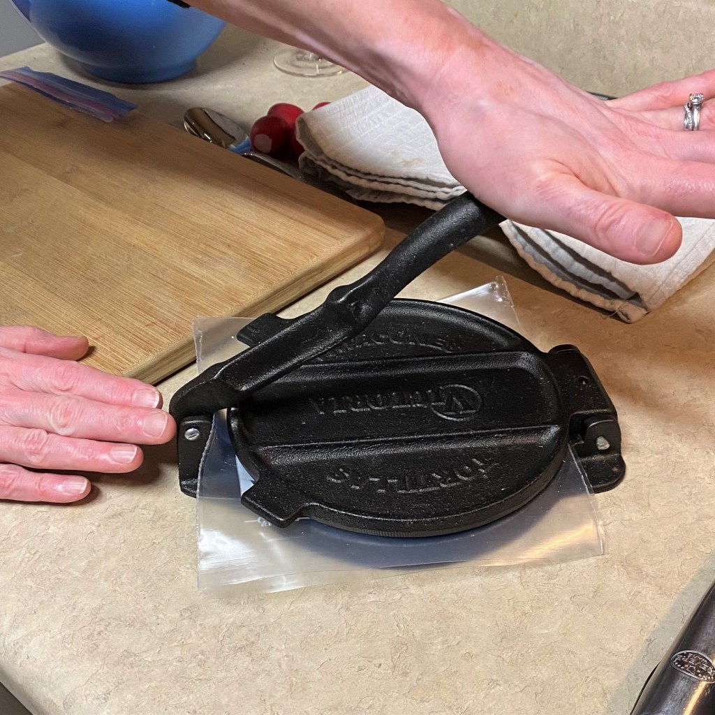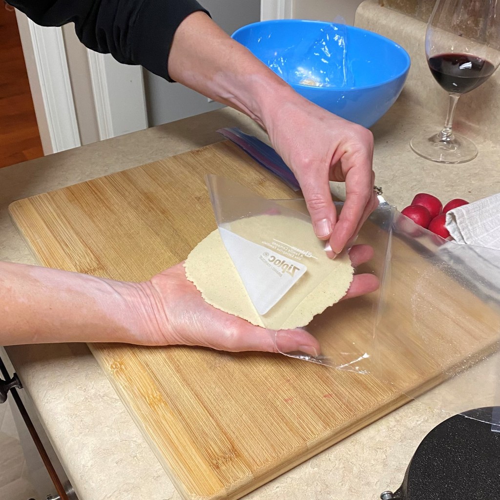 My pizzas are usually done in my home oven, outfitted with a 3/8”-thick slab of steel, preheated to 550° F for at least an hour. In other words, hot! For this one, though, my husband and I did the baking outdoors (clambake style!) on our Napoleon gas grill, which gets even hotter than the oven. We purchased a Weber pizza stone that works great for summer baking when we don’t care to heat up the house. Les handled all of that while I prepped inside, beginning with shaping my dough into a 14-inch round and laying it on a flour- and cornmeal-dusted bamboo peel.