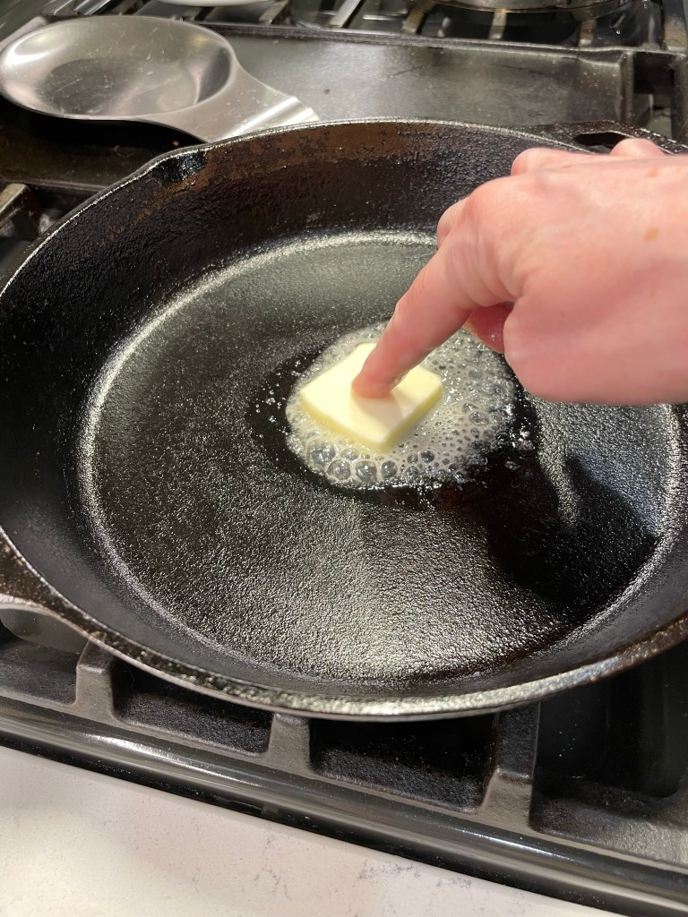 - Heat a small sauté pan over medium heat with a tablespoon of butter. Sauté the shallots for a few minutes until slightly softened. Drain the potatoes and add to the pan, tossing to crisp up the sides.
