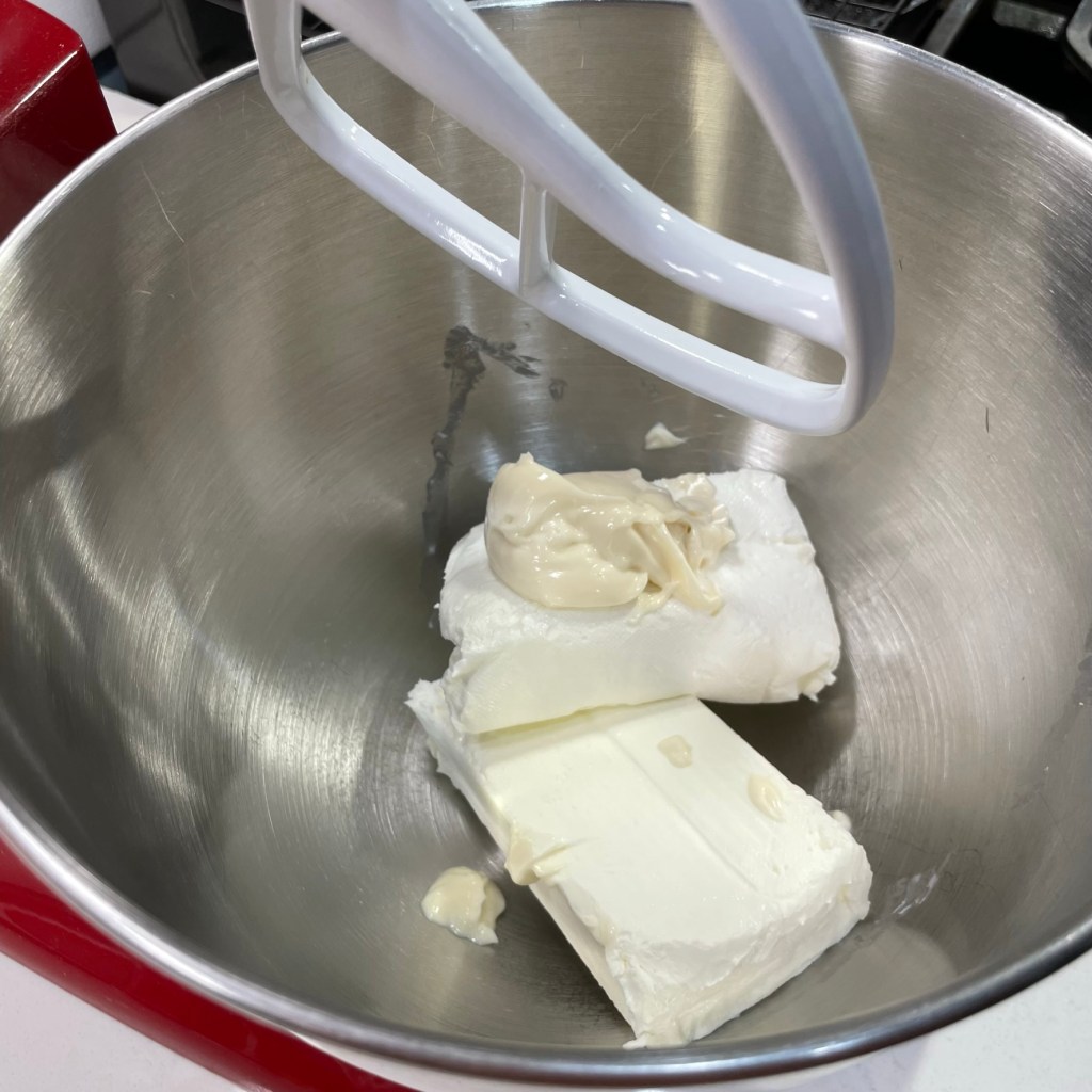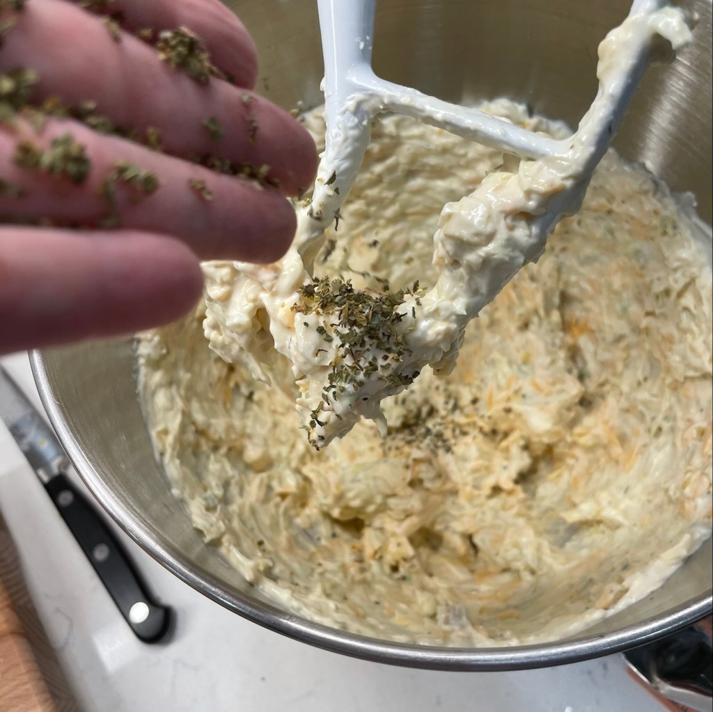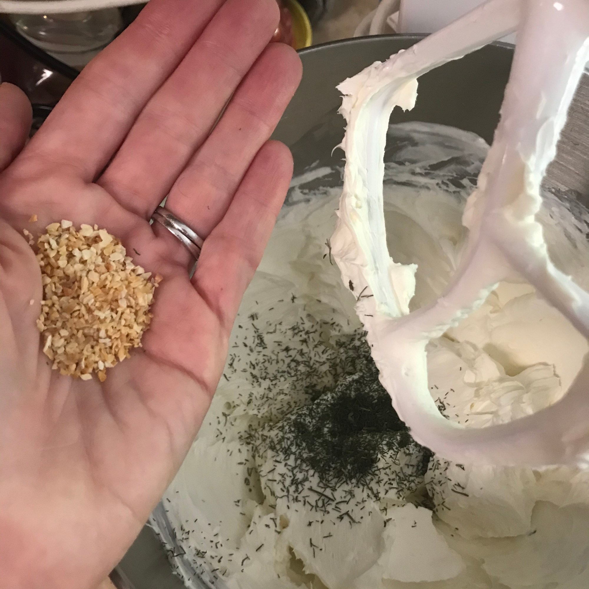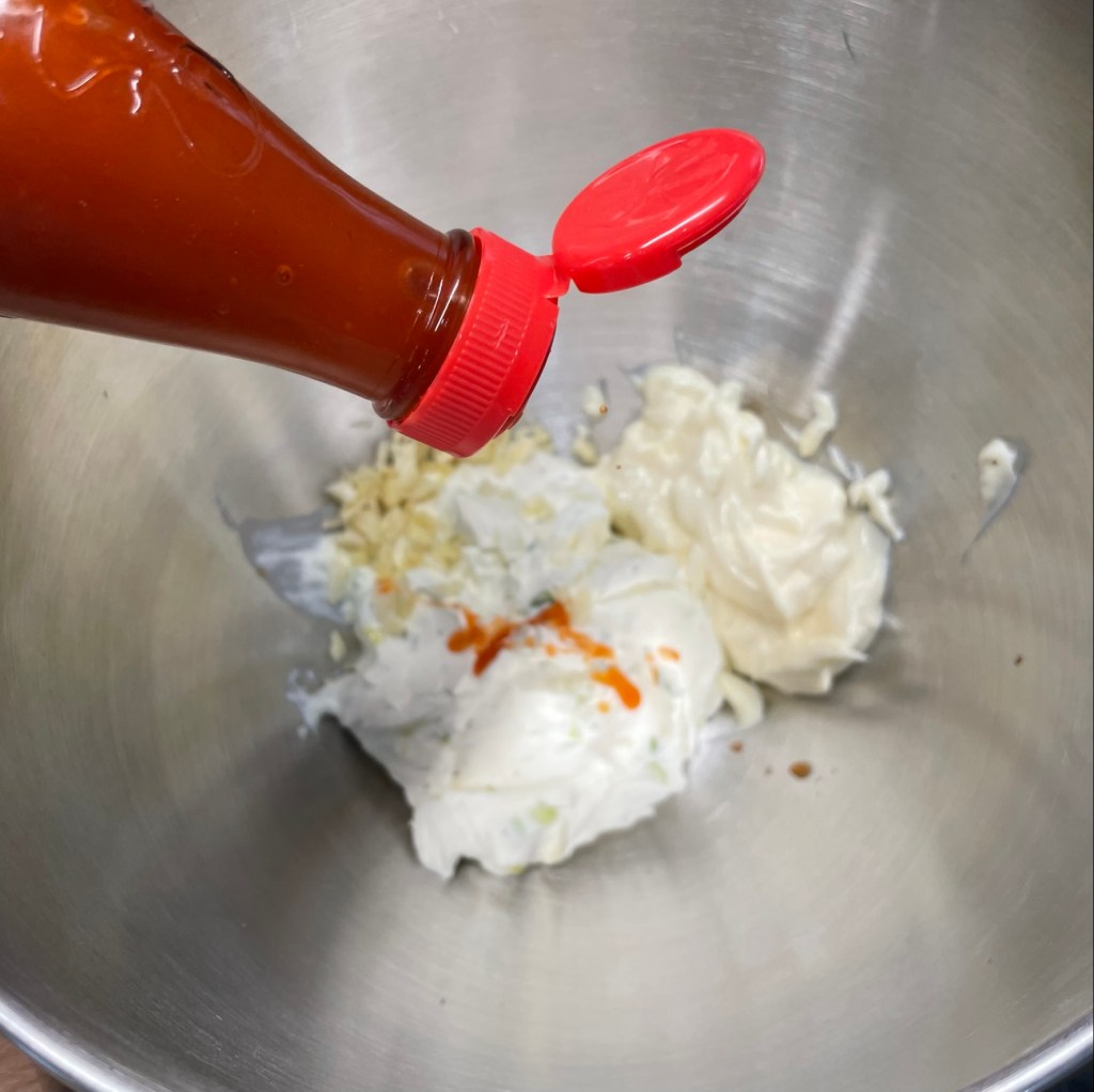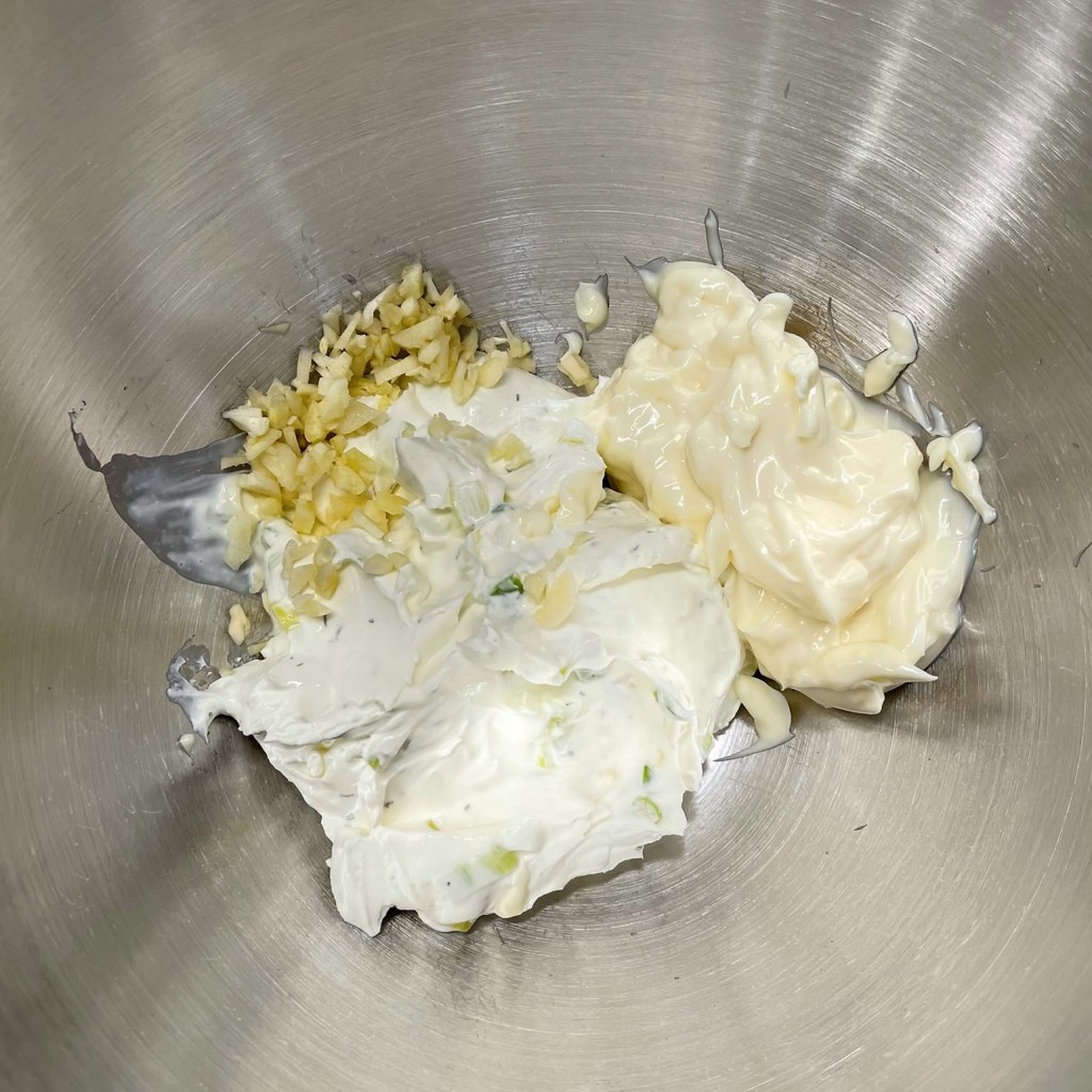 - Combine cream cheese, mayo, sour cream, garlic and pepper flakes in the bowl of a stand mixer, fitted with the paddle blade. Beat until evenly blended.