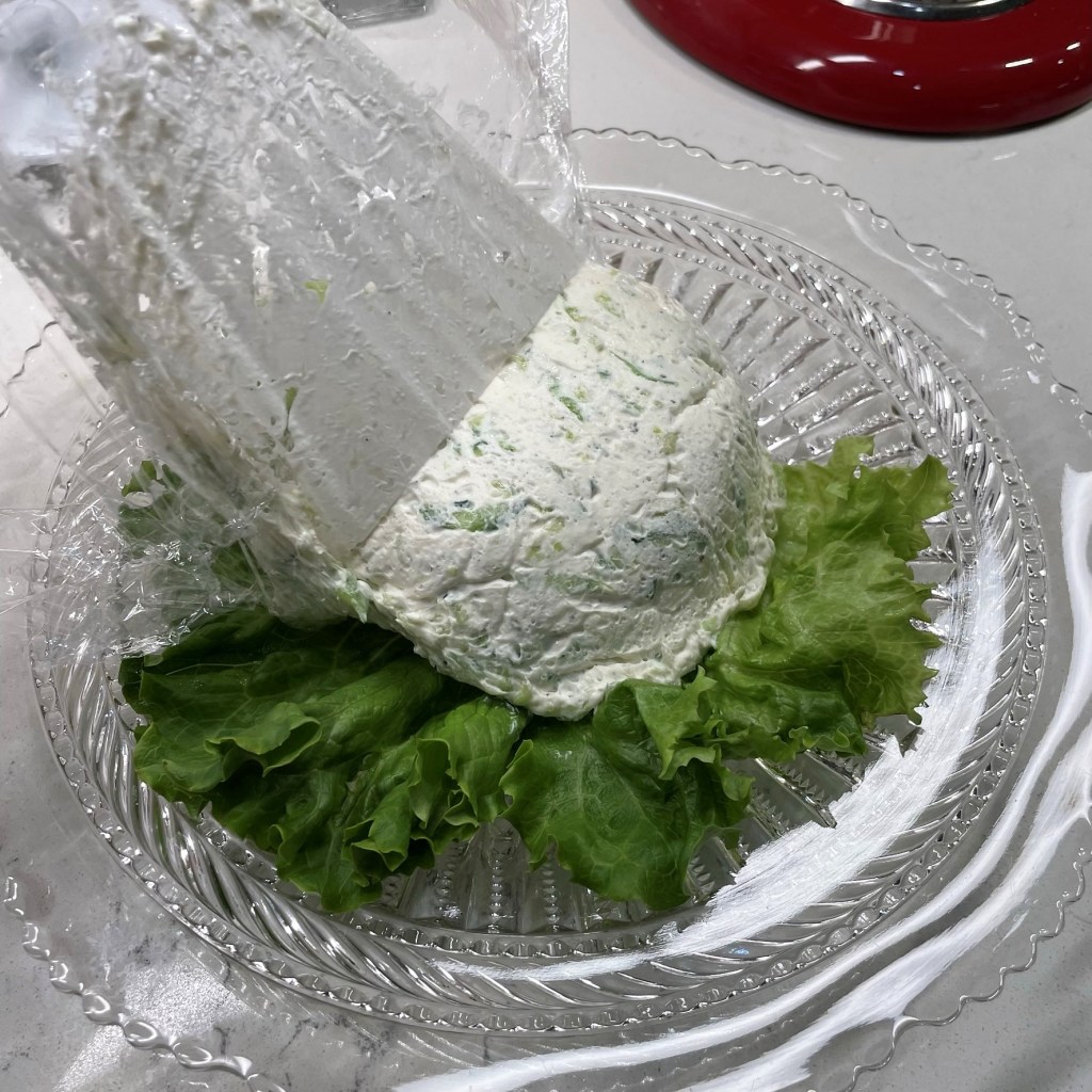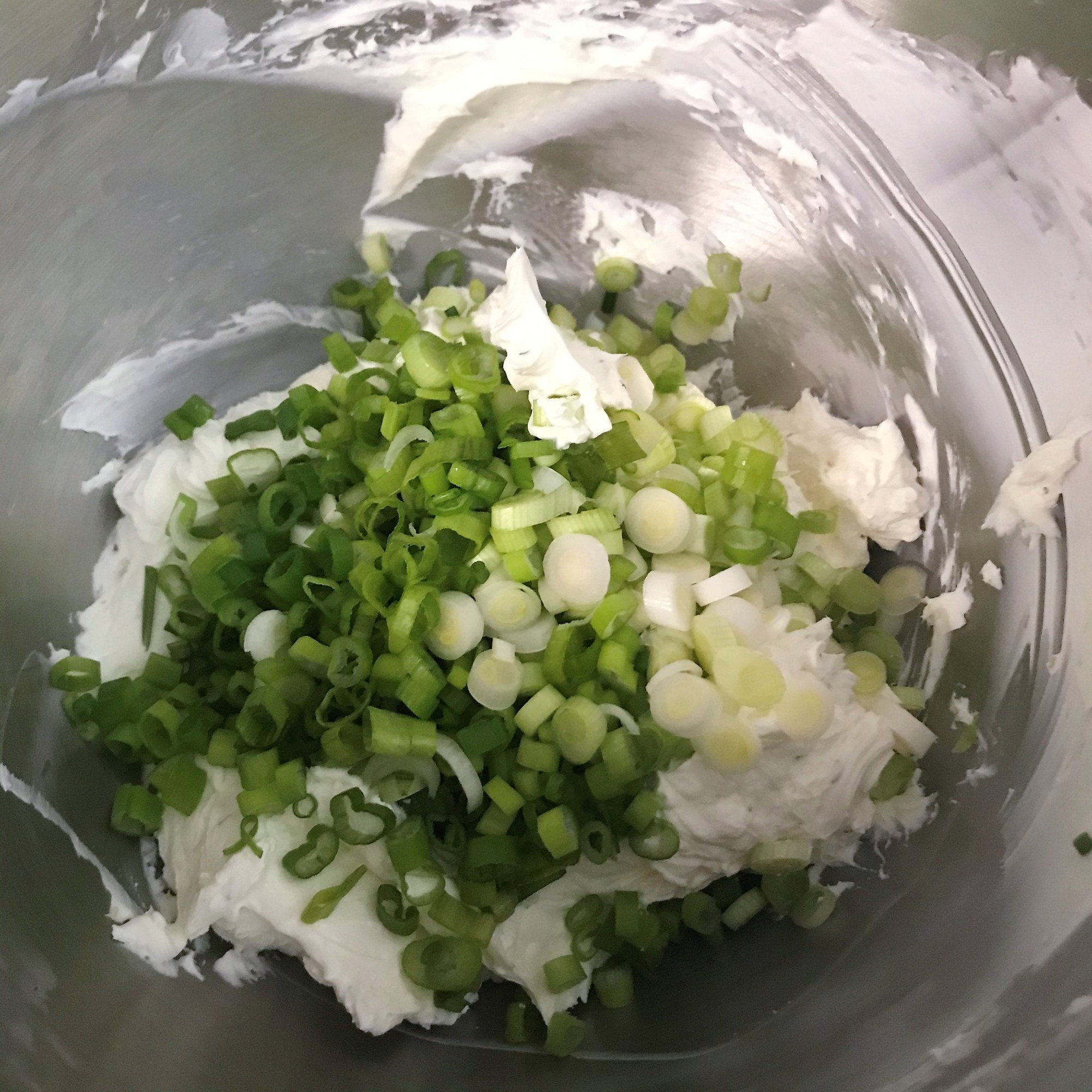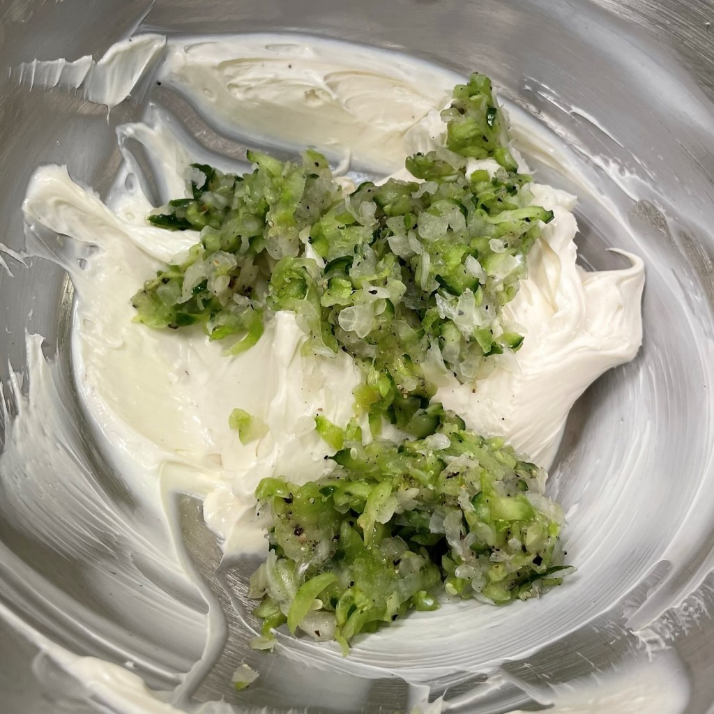 This recipe begins as all of my creamy dips do, with a brick of cream cheese, some mayonnaise and a bit of sour cream. This combination creates a smooth, creamy base that is neither too heavy nor too oily. This collard dip called for bold flavors, so I tossed in some minced garlic and crushed red pepper seasoning, then I blended it into a creamy concoction in my stand mixer.