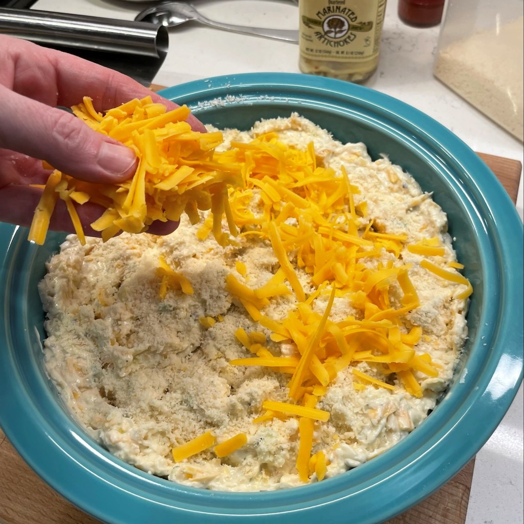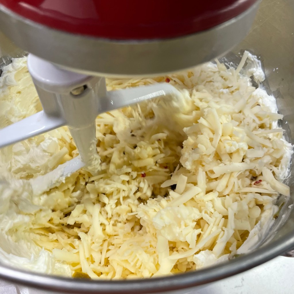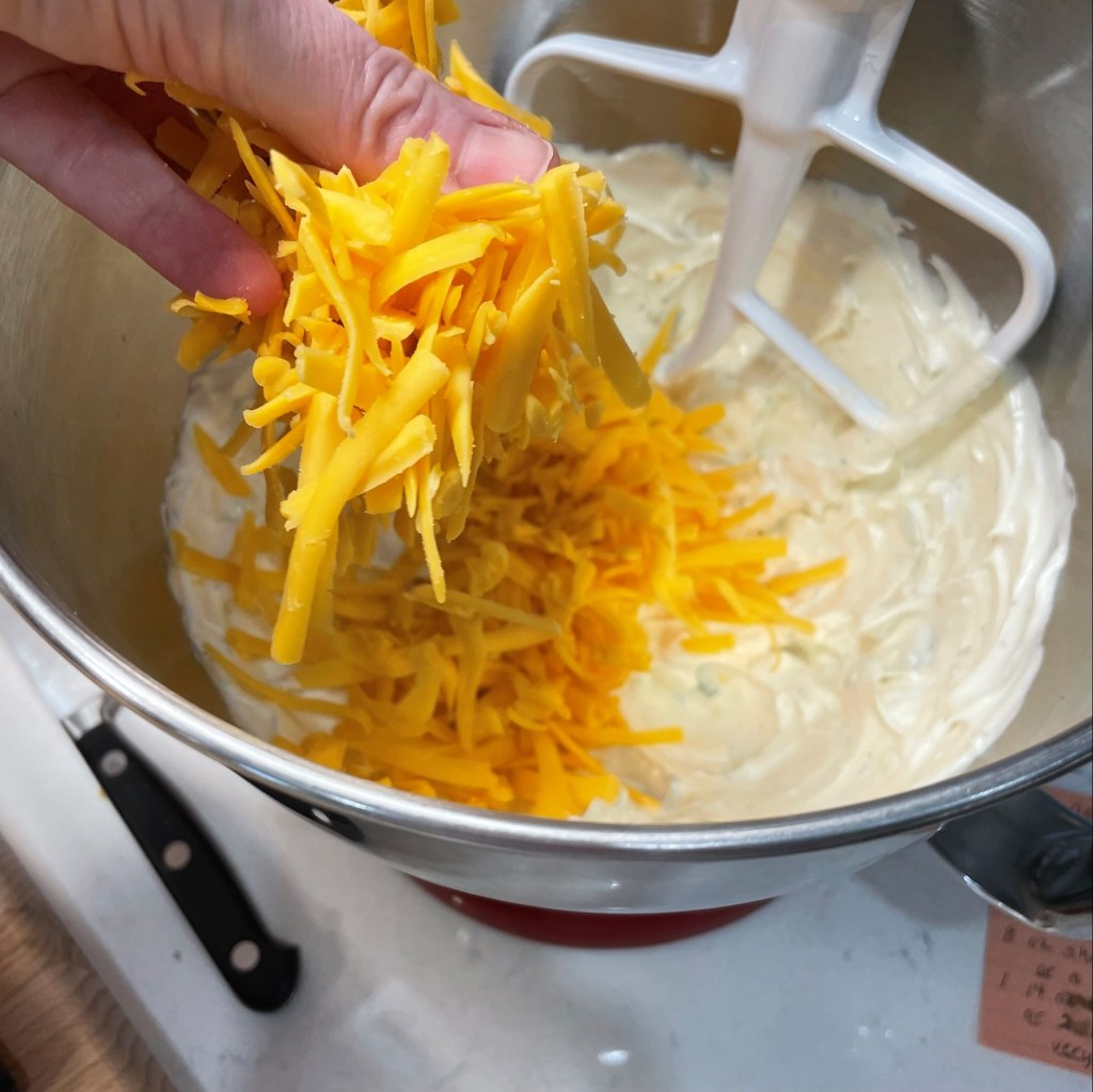 - Add cheddar and mozzarella to the bowl and mix until combined.
