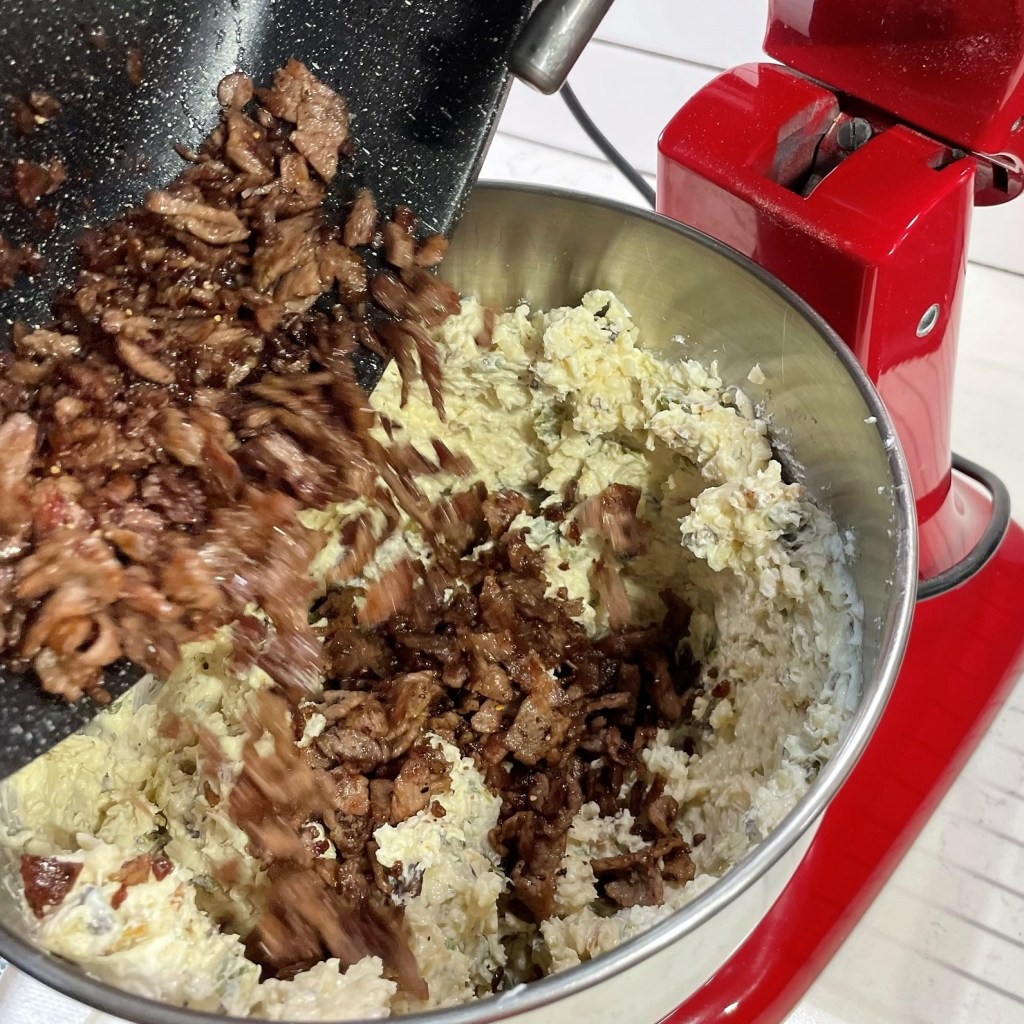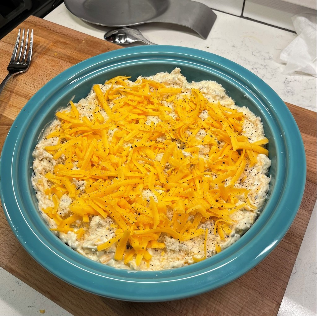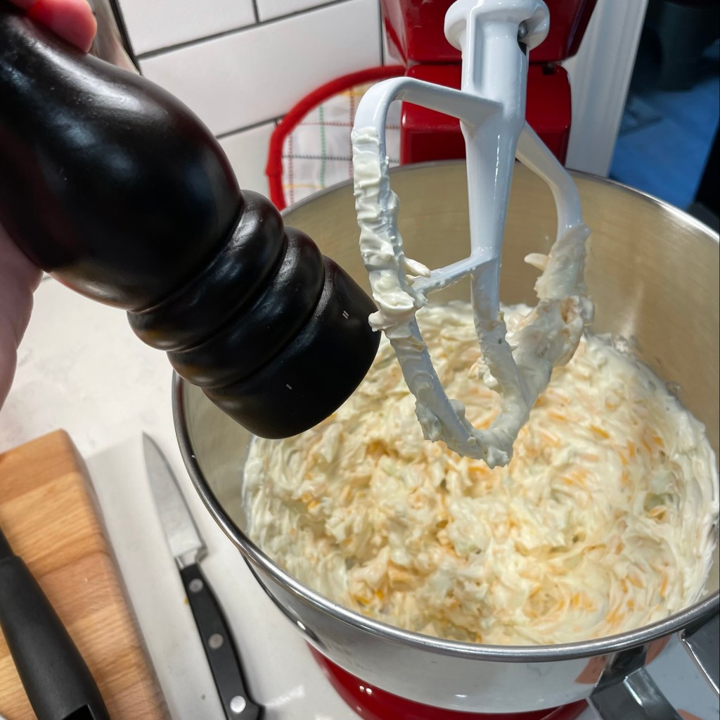- Add cheddar and mozzarella to the bowl and mix until combined.
