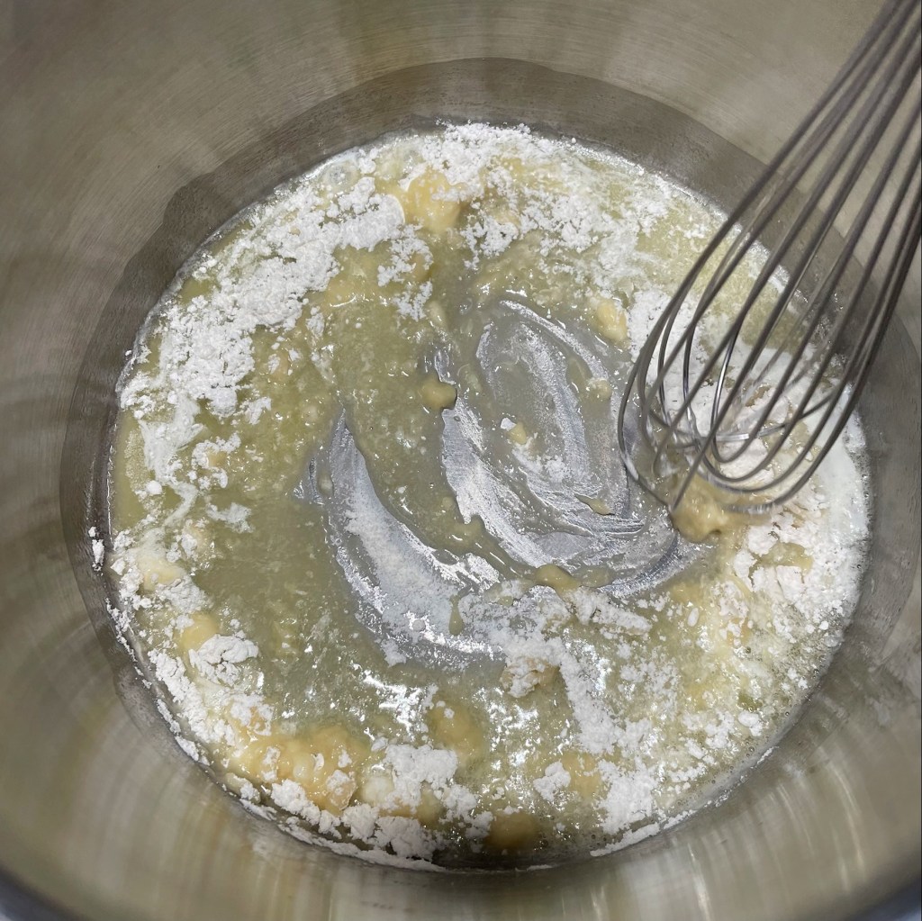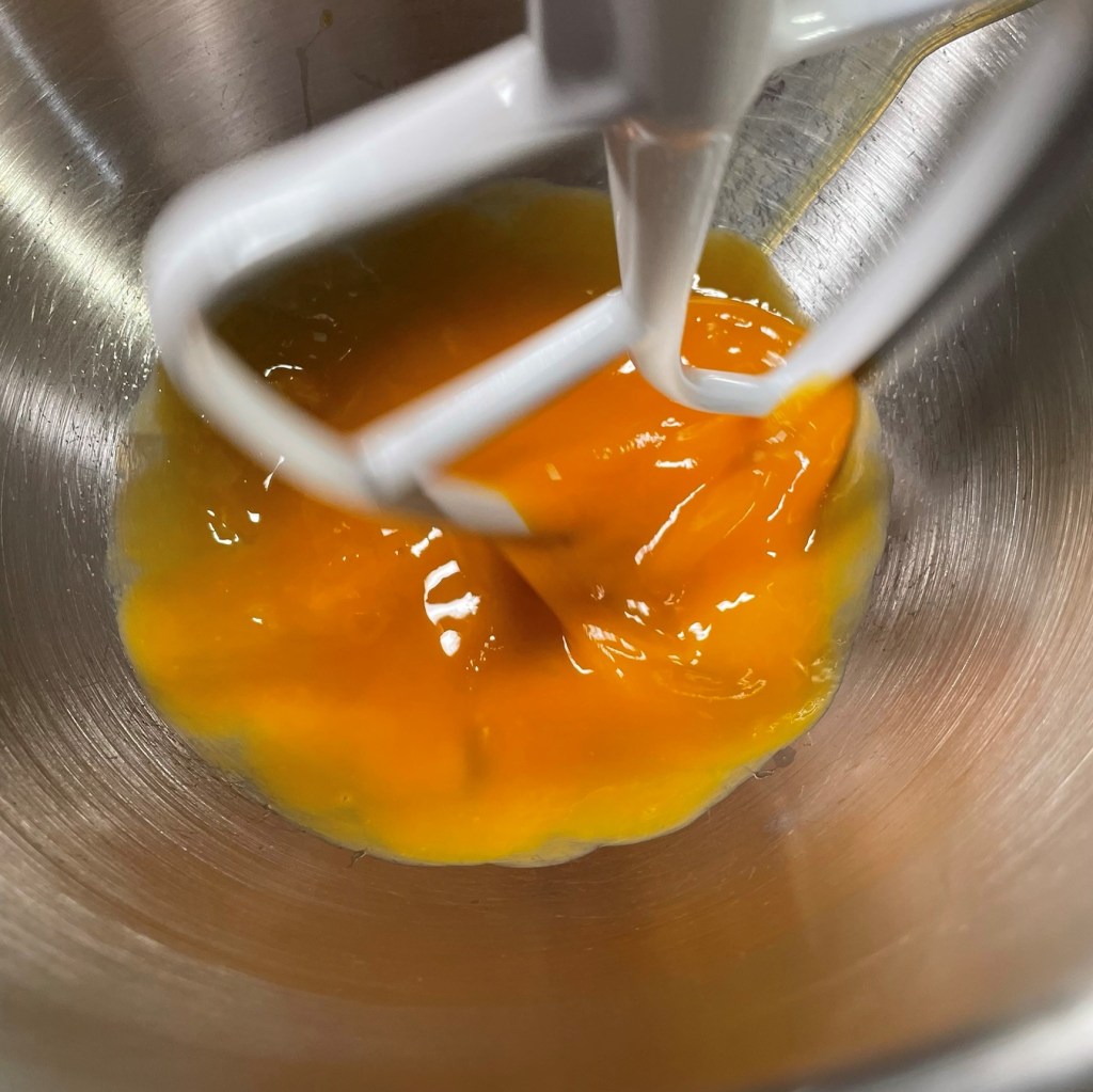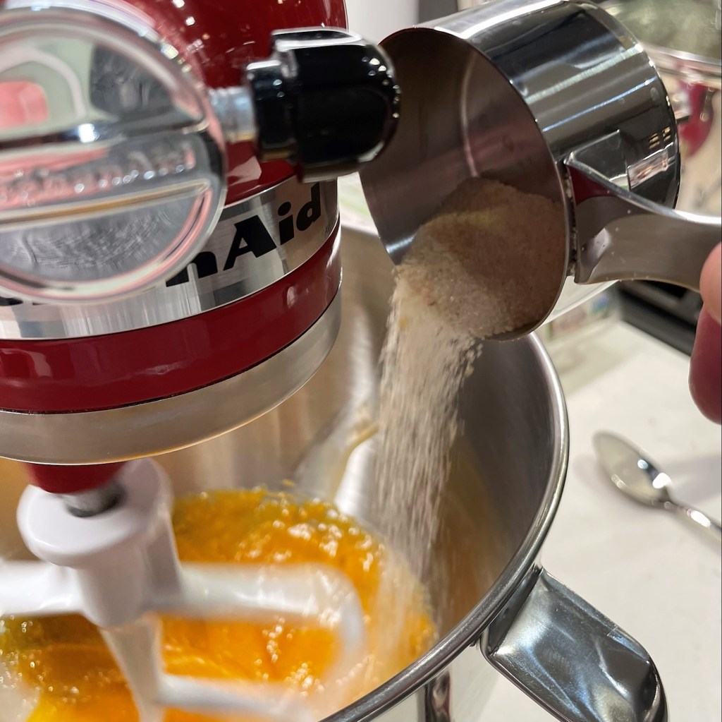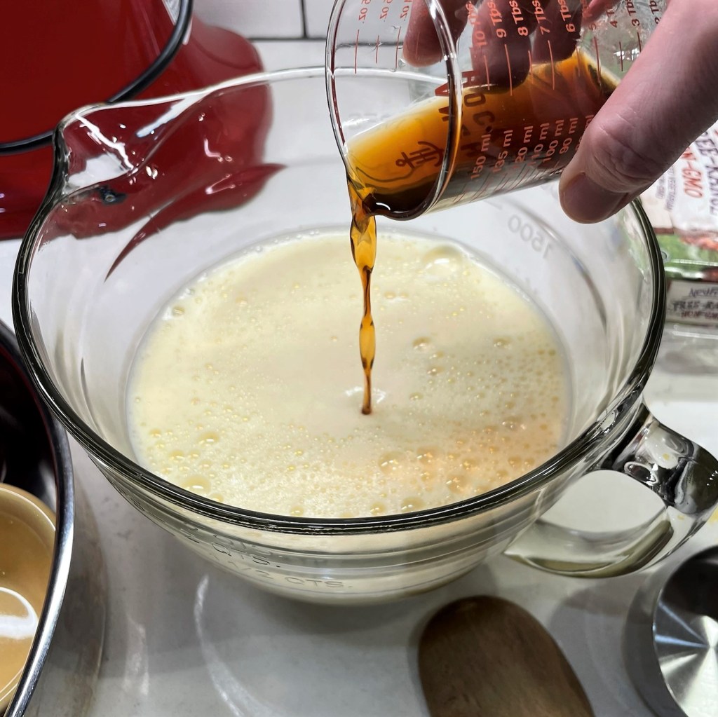 - Add brown sugar and sour cream, whisking on low speed until blended. Gradually pour the milk into the bowl while the mixer is running, to avoid splashing. Add the eggs, one at a time and then stir in vanilla.