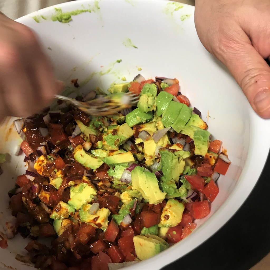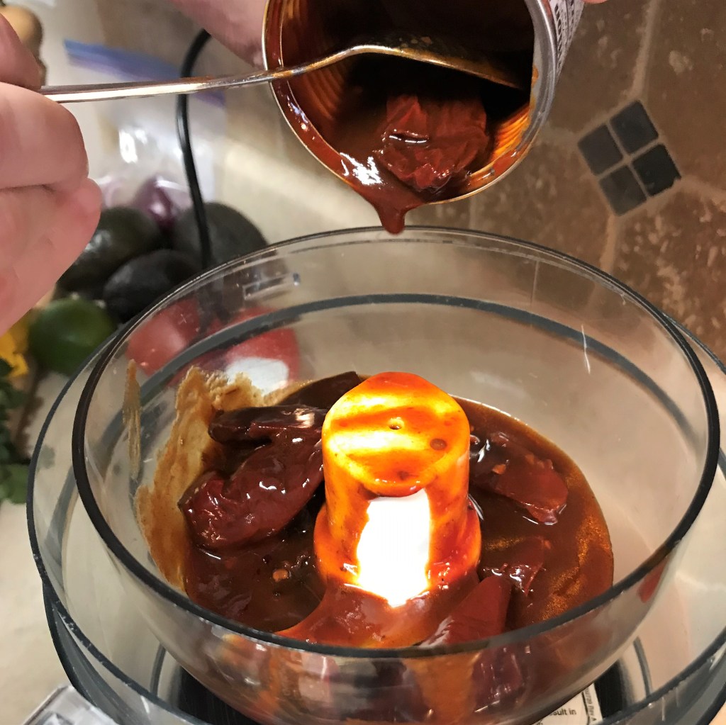 Use the large bowl of a food processor (or a good blender with the vent cover off) to combine the warm chickpeas plus a little bit of the liquid, half a roasted sweet potato, some tahini and salt. Pulse several times until you have a somewhat smooth mixture of hummus. This was my first shot at using harissa in hummus, so I gave it a quick sample test and found it to be a great pairing with the sweet potato! If you are not familiar with harissa, it’s a spicy chile pepper paste common to Morocco and other mideast cultures. It usually includes some variety of chiles, plus garlic and seed spices, such as caraway, coriander and cumin.