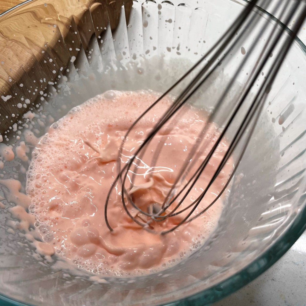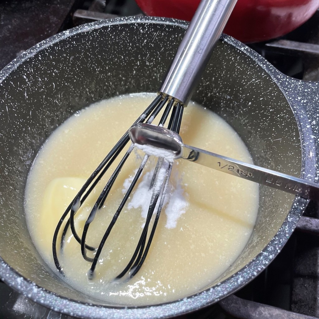 One of the things I wanted to avoid with this recipe was having a batter that was too wet. Pancakes need a certain amount of heft to hold up when they hit the griddle, so I opted to roast my sweet potato rather than boil it in chunks. This also turned out to be an easier method, given that I didn’t have to mess with peeling or cutting up the sweet potato. I scooped out about a half cup of the flesh and blended it with egg, buttermilk and melted butter, then stirred it into the drained mushy cornmeal.