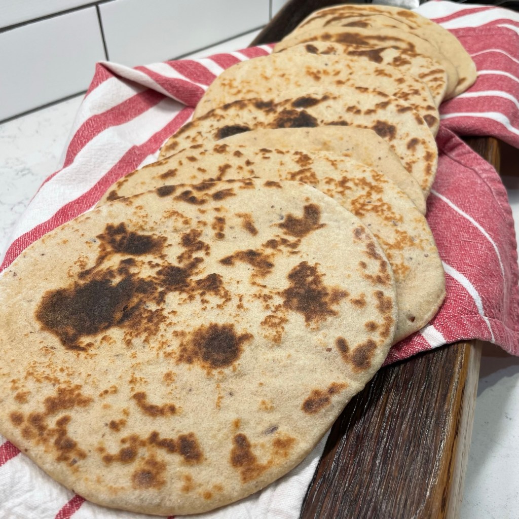 For these soft wraps, I’ve taken a recipe that I posted in May 2020, when my blog was still in its infancy, and I’ve flipped the ratio of flours so that it uses twice as much white whole wheat as all-purpose flour. That earlier recipe for Soft Pita Breads is still great, and I’ve linked to it so you can check out the original. But this version, in all its whole grain glory, turned out so good with the falafel we made at home recently that it will become my go-to. What makes the pita breads so soft and bendy is an unusual technique of pre-cooking a portion of the flour before adding the rest of the ingredients. The pitas are “baked” on a griddle rather than in the oven, or you can use a dry cast-iron skillet if that’s what you have.