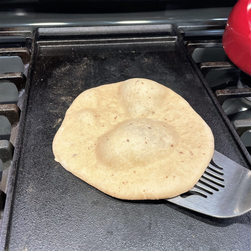 When the second side is cooking, expect the pita to puff, maybe a little or maybe a lot. Use the spatula to gently roll it around on the griddle so it cooks evenly.