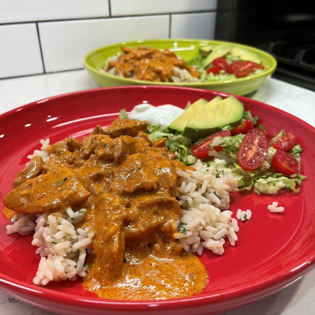 Besides being simple and delicious, this dish is also relatively healthy, as I used cream cheese rather than heavy cream to thicken the spicy sauce. This eliminated the need for flour as a thickening agent. And for our at-home pollo chipotle, I jazzed up a simple pot of brown rice with a shake of cumin and a small handful of chopped cilantro and served it alongside a simple salad with fresh tomato and slices of ripe avocado.