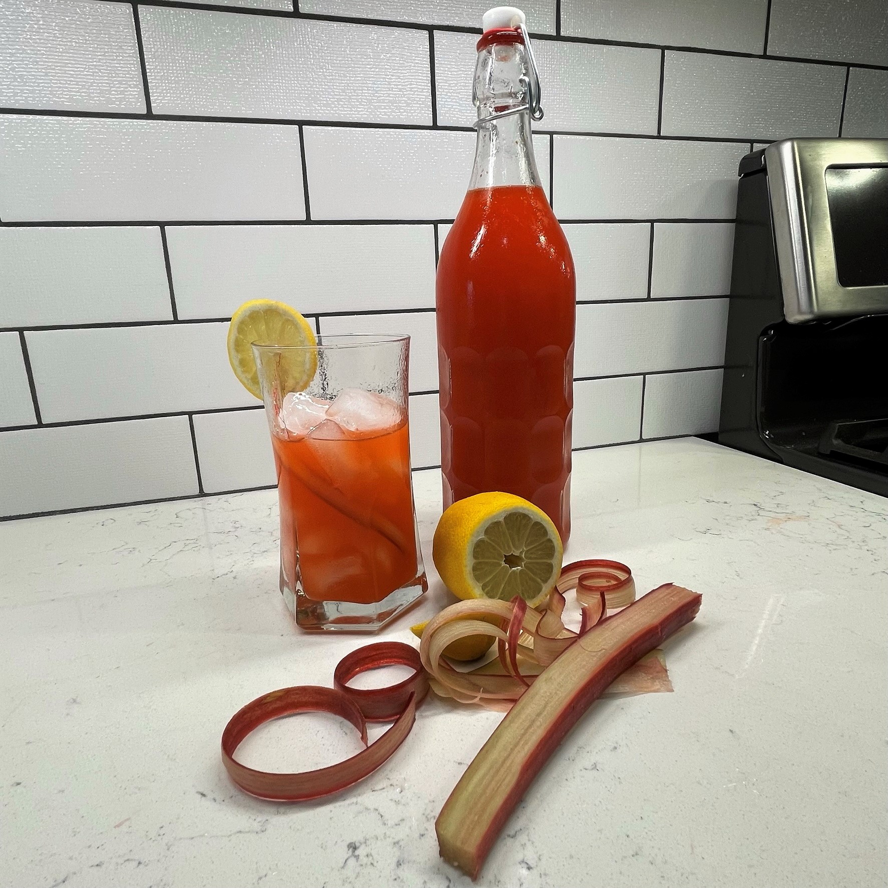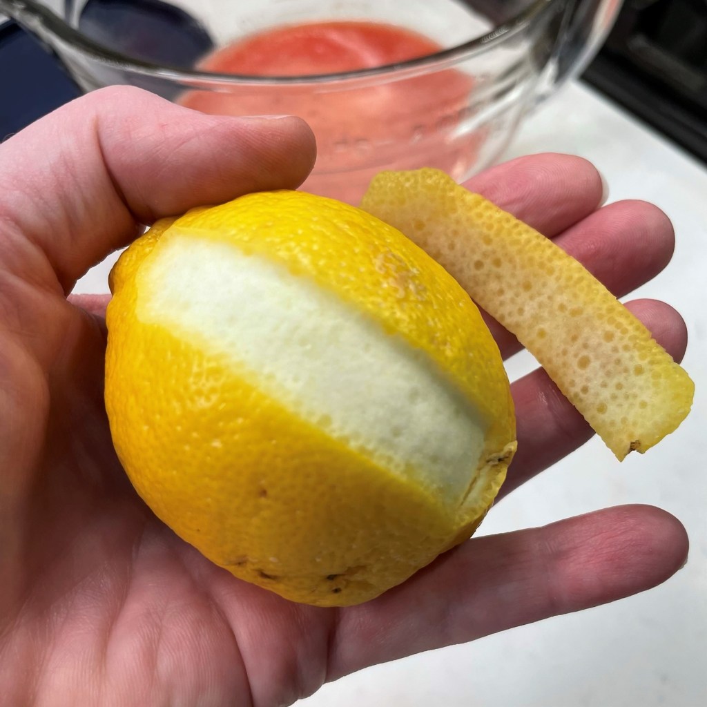 Rhubarb is technically a vegetable. Trim and cut up two fat stalks for this recipe.I made my rhubarb syrup first, with water and cane sugar brought to a boil, then steeped until cool.Don’t discard the rhubarb bits. Add them to your morning yogurt or just nibble them as they are!Next time, I would definitely combine the two syrups into one, but I was on a creative roll!Strip the peel from an organic lemon, but avoid the white pith, which is very bitter.Steep the strips of peel in the simple syrup until cool. This helps extract the lemon oils for extra flavor.Clean, halve and juice six average lemons, until you have about 3/4 cup juice. Any time you are using the lemon peel in a recipe, choose organic. The lemons I squeezed for juice were conventional.Add a cup of water to the fresh strawberries, to aid in pureeing them.It only took about 30 seconds for my tall, handsome blender to turn these berries to puree.Strain the puree into a large pitcher bowl, filtering out as many of the tiny seeds as possible.I used my fun new blender to puree the berries, but this would also work fine in a food processor.Strain the lemon juice into the strawberry puree. These flavors are so bright together!The rhubarb syrup adds another layer of “pink.”Finally, the lemon peel syrup, and the pink lemonade base is ready!Putting it all together is simple! Transfer the lemonade base to a bottle or pitcher and chill before mixing it with still or sparkling water.