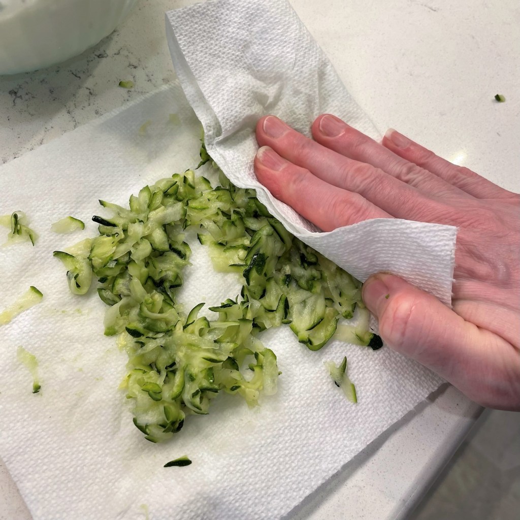 Sprinkle a generous teaspoon of salt on the zucchini shreds.Wrap it up in layers of paper towel and tuck it in the fridge for a couple hours.Press the salted zucchini with fresh towels to wick away as much moisture as possible.
