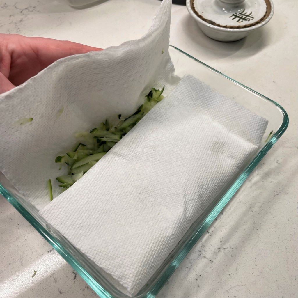 As with cucumber, the zucchini needs to be salted generously and rested in layered towels so that the excess moisture can be released. The amount of salt used to draw out the moisture is almost exactly the amount needed to season the dish, so it works out well.