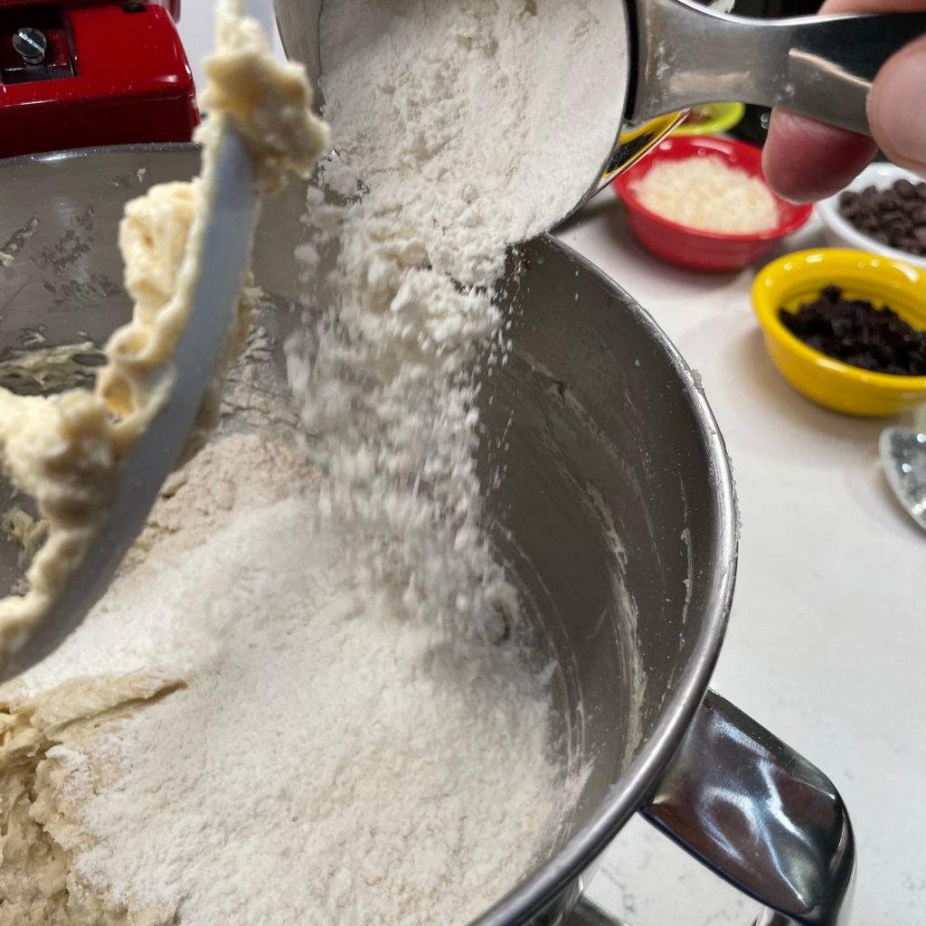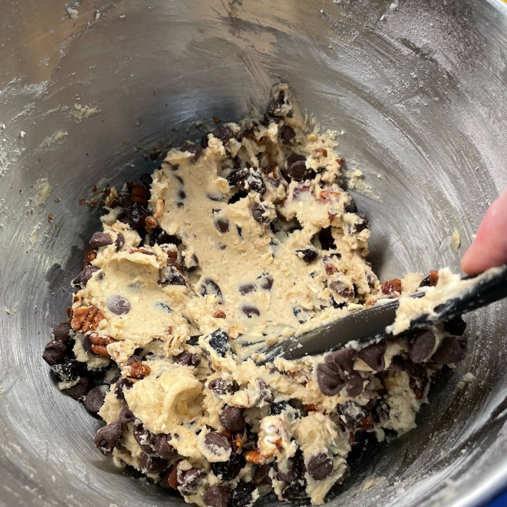 - Remove bowl from stand mixer. All remaining ingredients should be folded in by hand to avoid overheating. An easy way to incorporate the add-ins is to use a firm spatula or wooden spoon to try to “press” them down through the dough, beginning with the firmer ingredients (chips, dried fruit and pecans) and ending with the delicate ones (coconut and rice cereal).