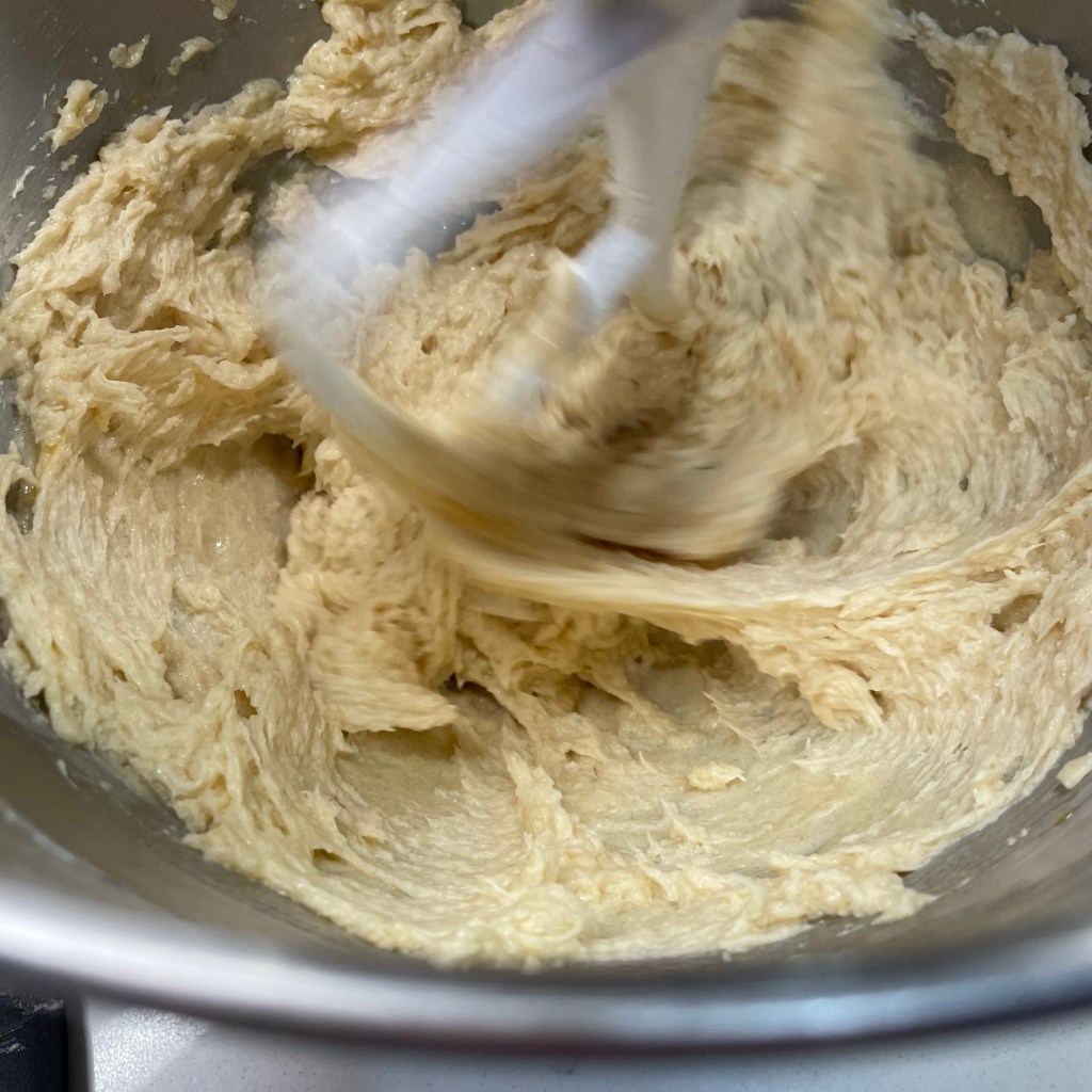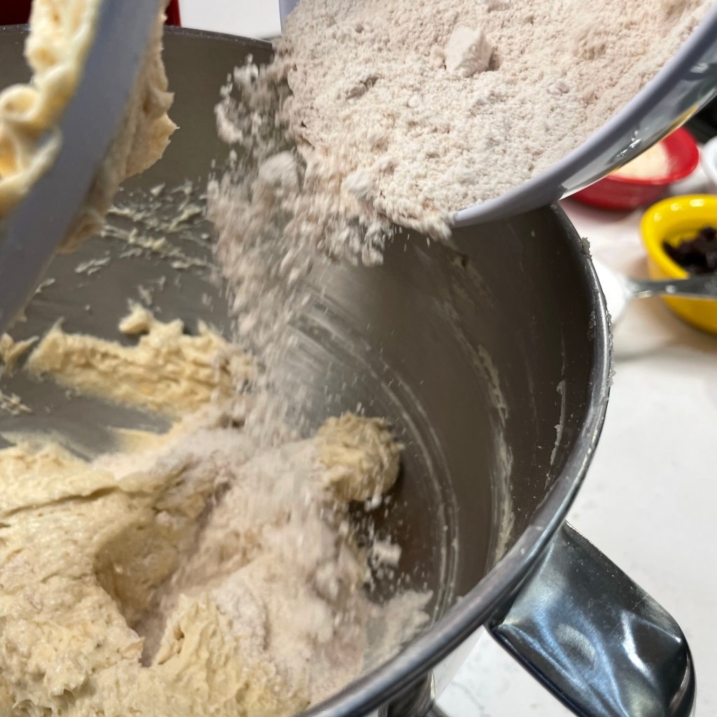 I mixed in the old fashioned oats first, because I can beat them vigorously without worry of gluten development. Next, the whole wheat flour mixed with the baking soda, salt and cream of tartar. Then, the rest of the flour, mixing just enough to work it into the creamed mixture.