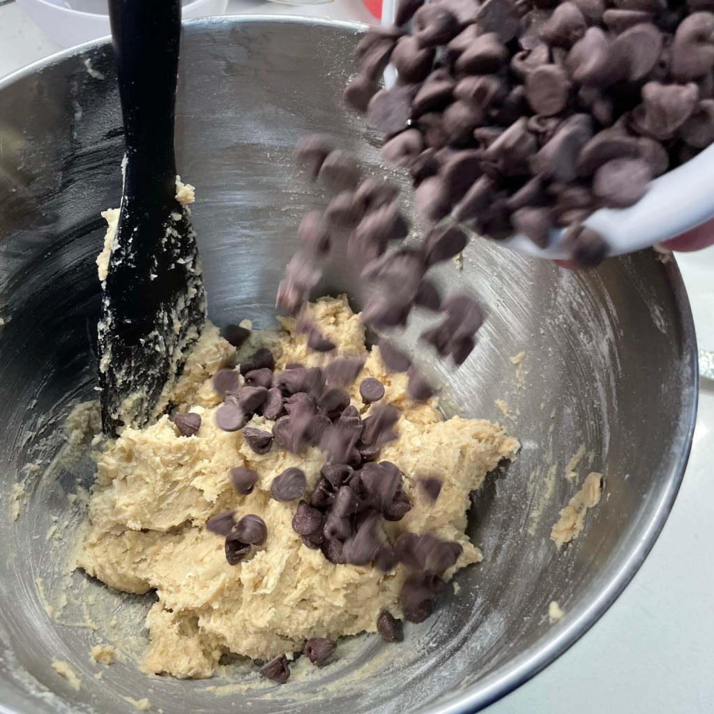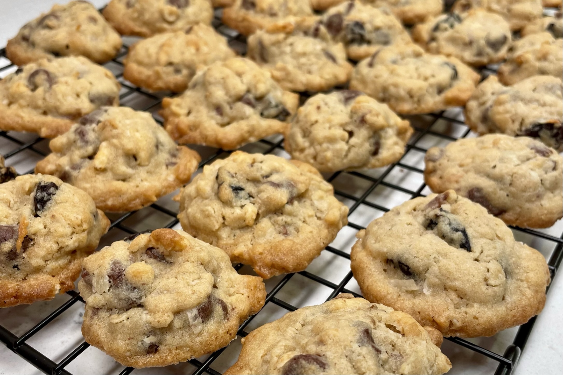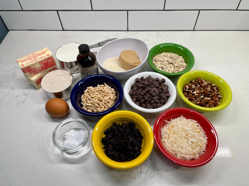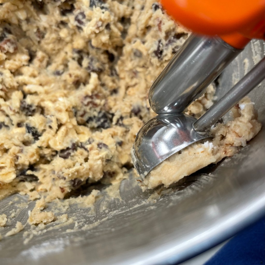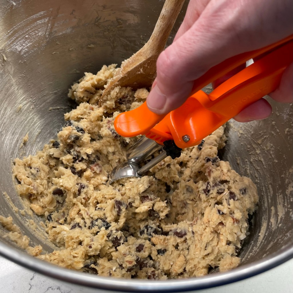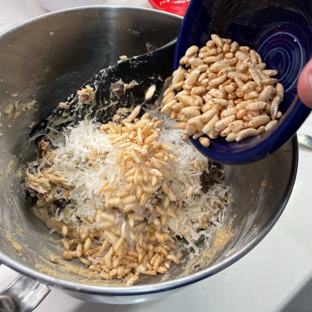 When you’re mixing any cookie dough, you want to avoid stirring too much after you add the flour, or the dough may get tough rather than soft. So for the mix-ins, I began with the really firm ones— chocolate chips, dried cherries and chopped pecans— and I used a hard spatula to essentially “press” them through the dough. Finally, I did the same with the toasted coconut and crispy brown rice cereal.