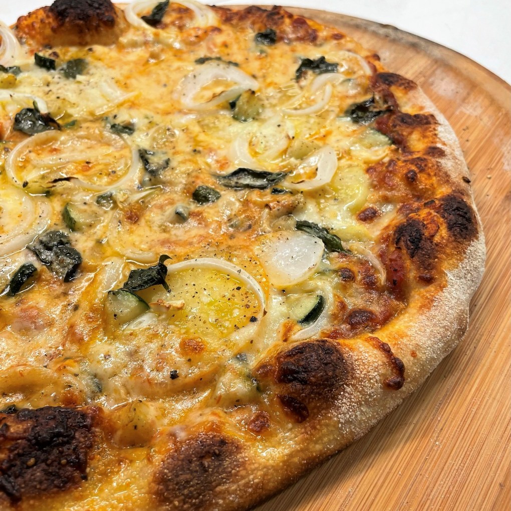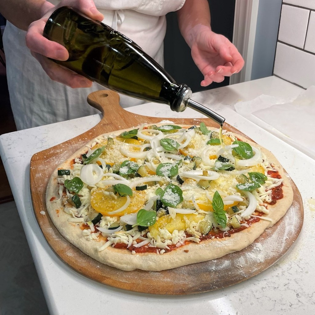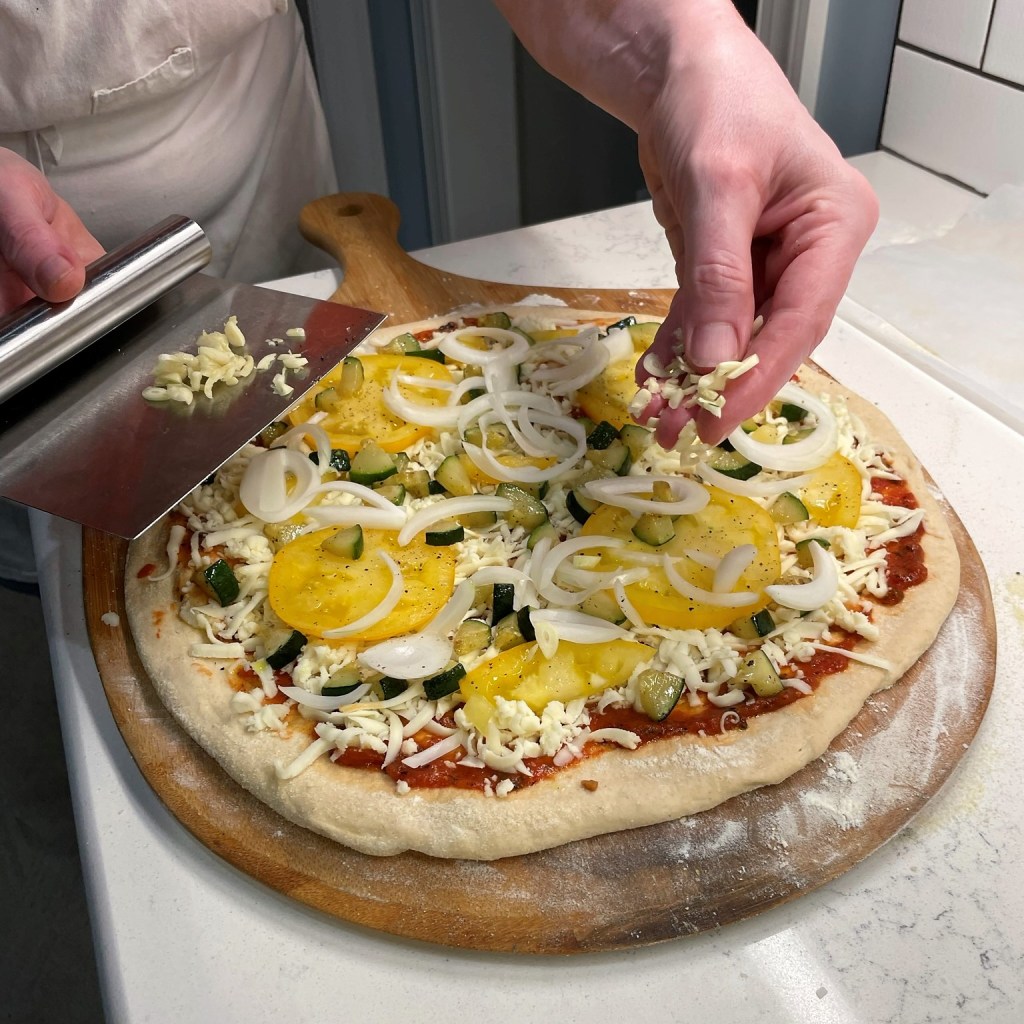 I used a mix of flour, including all-purpose, white whole wheat and semolina. A generous sprinkle of onion powder gave the dough an underlying flavor to support the ratatouille theme, and I gave it a good long kneading to build strength in the dough. I wrapped it up and tucked it into the fridge for a few hours to rest. If you need to save time, you could make the dough a day ahead.