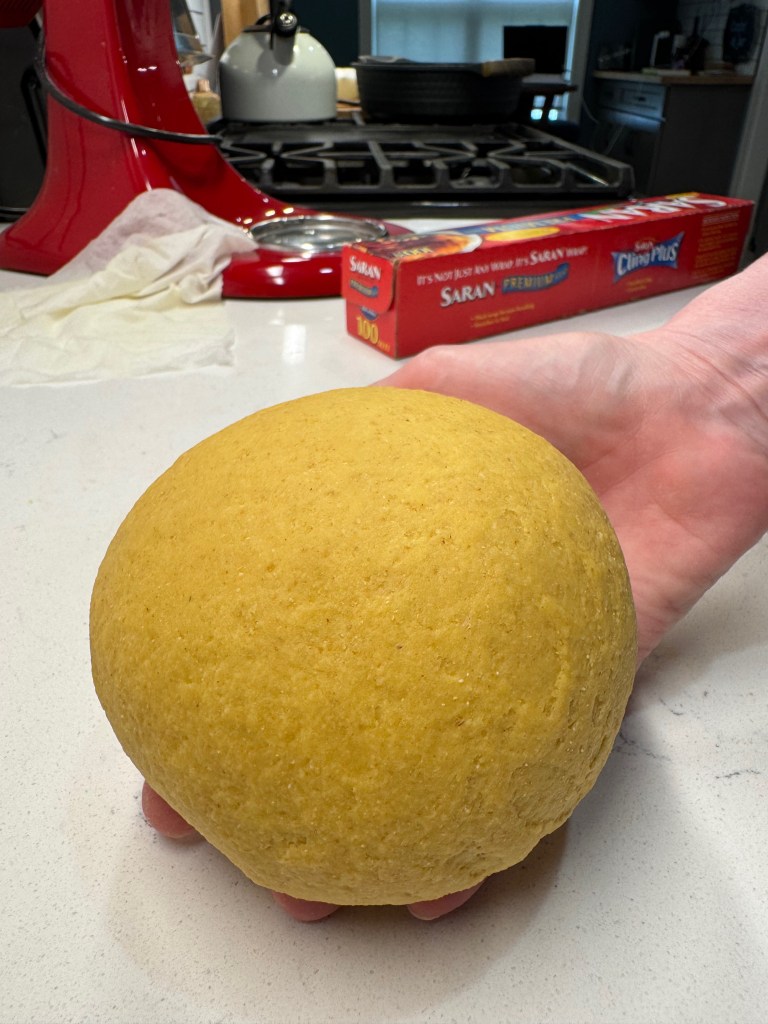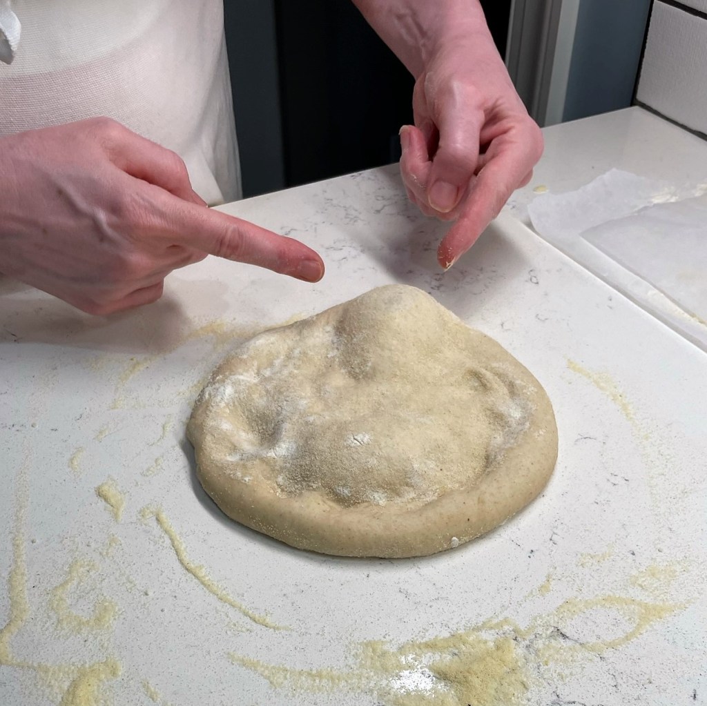 - Transfer dough to the counter and knead by hand for about eight minutes, until smooth, firm and supple. Wrap dough tightly in plastic wrap and refrigerate at least 30 minutes or up to a day before rolling and shaping.