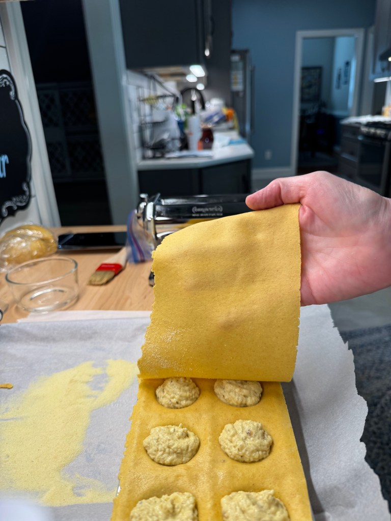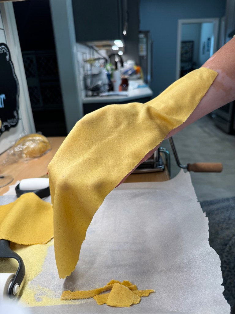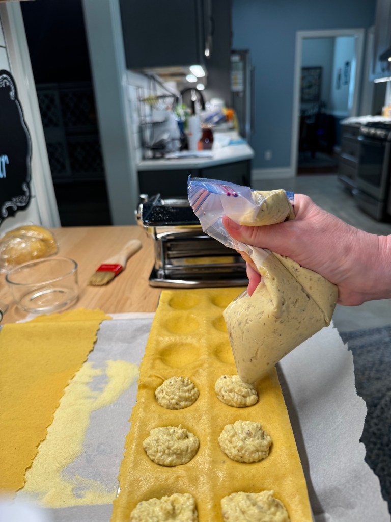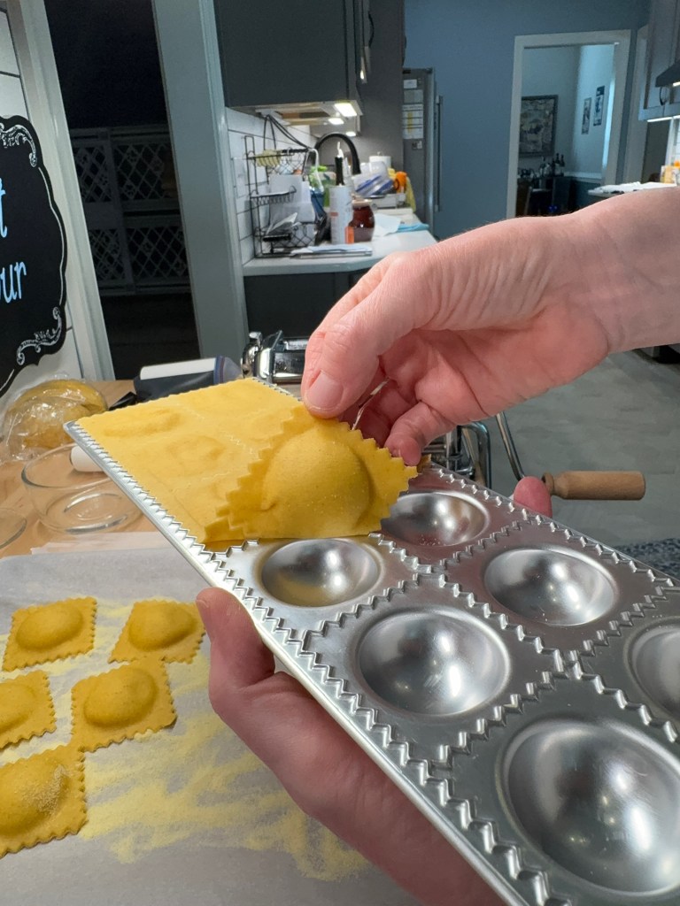 - Divide dough into sections and roll out with a pasta machine or rolling pin to approximately 1/16″ thickness. Use a piping bag to apply filling, then lightly brush another sheet with cold water and seal up each pillow, pushing out any air as you go. Transfer raviolis to a parchment-lined cookie sheet sprinkled with semolina.