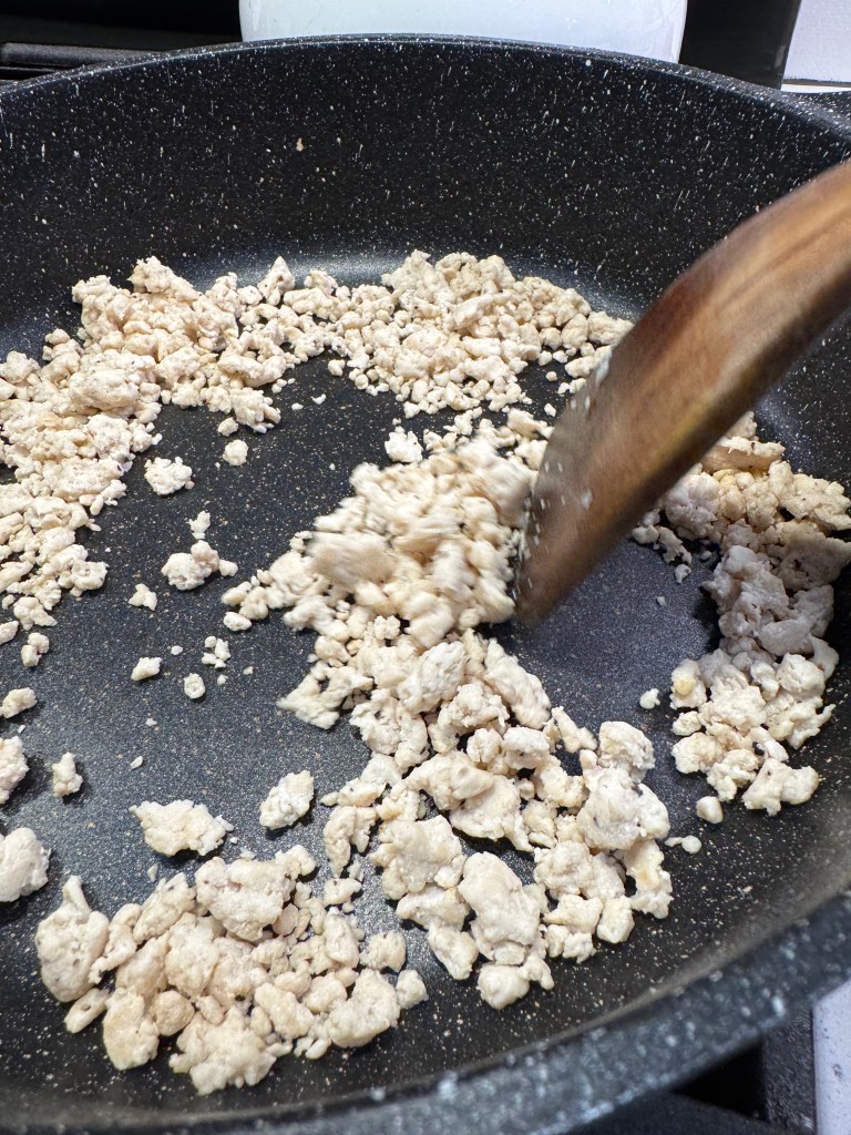 - Add ground chicken to the same pan, cooking gently until meat is no longer pink, but do not let it brown. Season the meat the salt and pepper and allow it to cool.